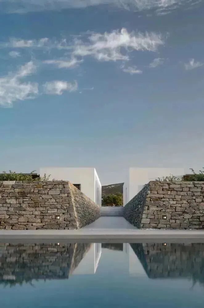 石墙外围设置泳池,造景的同时以水展示自然和生机,石景墙、建筑和水池结合在一起,构成一幅现代自然的景观布局。