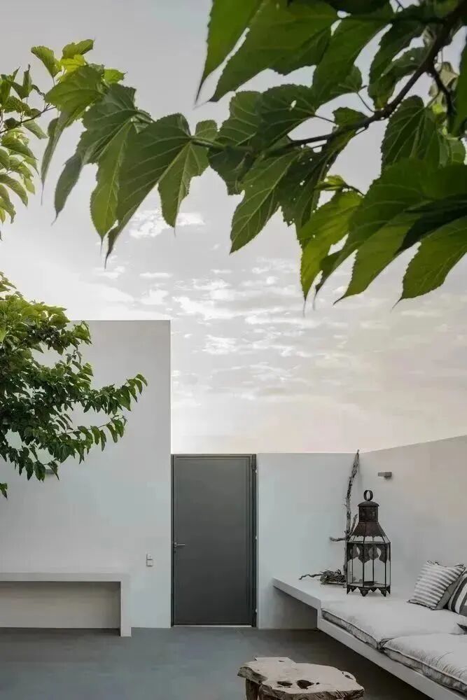 入口处设有凉棚,自然花境环绕,观景的同时有遮挡,内庭点缀几颗小乔木,绿叶洒下,在一片纯白主基调中绿色尤显珍贵。