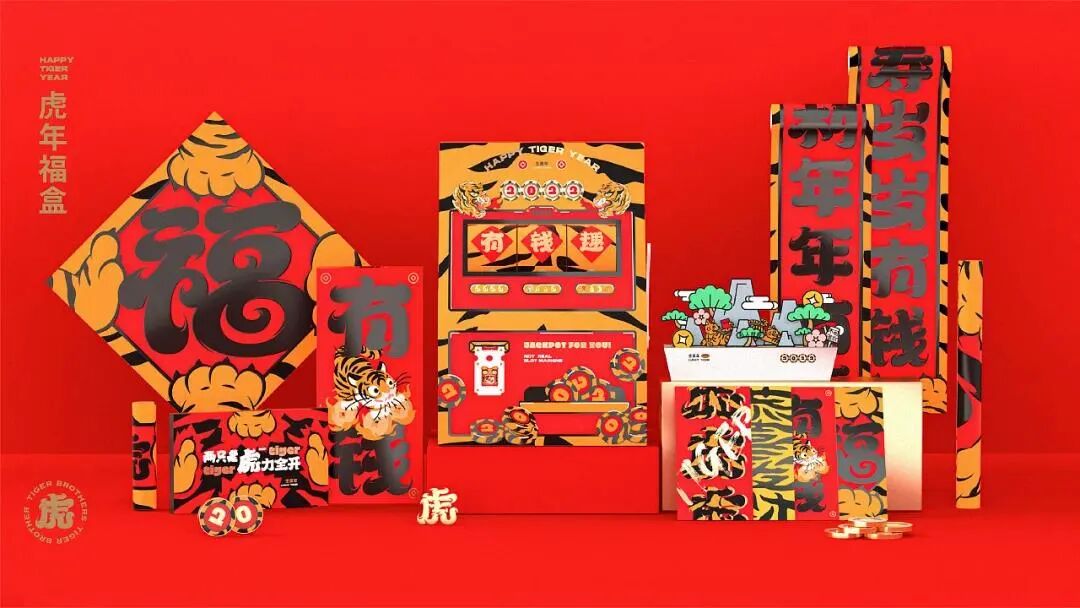 無非Brand设计团队以老虎机作为福盒的载体,成为外盒造型。机身上的相关设计装饰传达虎年好运翻倍、财运翻倍、幸运翻倍。