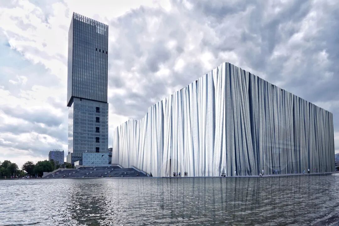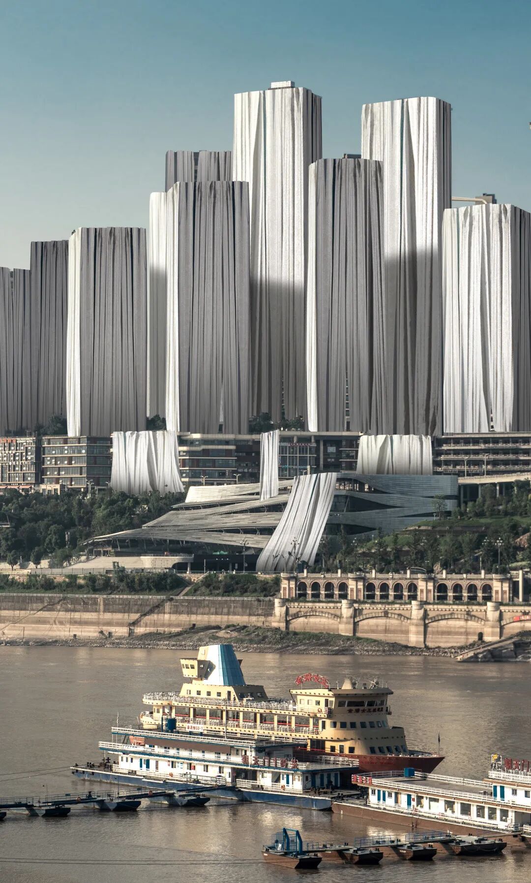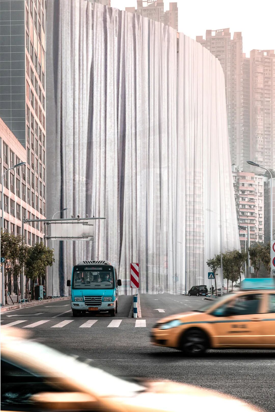 我知道这个创意来自艺术家,他们总是擅长进行脱离现实的视觉游戏。大面积布料的垂坠质感干脆利落地勾勒出建筑的几何轮廓,呈现出草图阶段体块推敲般的抽象感,游离于真实与抽象之间,虽然潦草概括,却是塑造过程中蕴含可能性最丰富的阶段,往往能反应方向性的关键信息。所以借此重新审视一番后不得不承认,来福士或许从一开始就注定与公众的期待背道而驰。