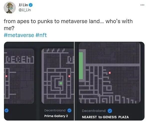 2021年11月23日,著名华人歌手林俊杰在推特宣布持有三块Decentraland虚拟地块:Prime Gallery 1、Prime Gallery 2、NEAREST to GENESIS PLAZA。