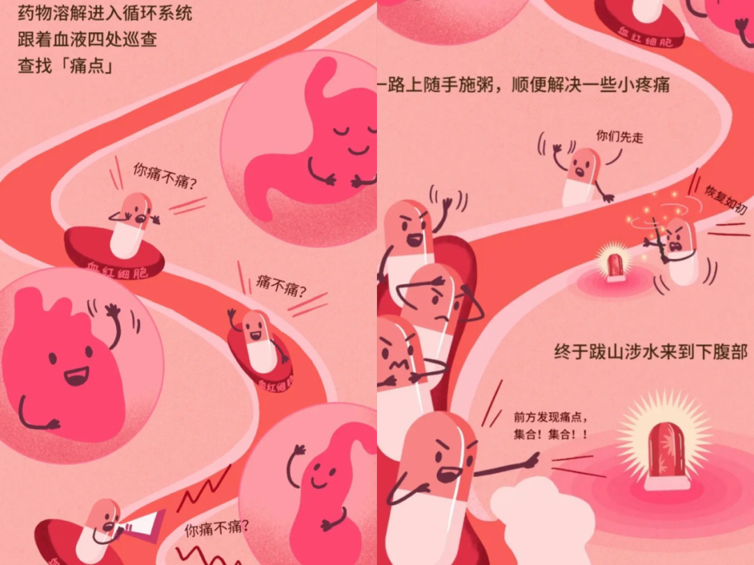 那么,布洛芬如何确认我们身体的哪个地方在痛呢?这一过程早已不是秘密了。丁香医生就曾以一组漫画生动描述了布洛芬在进入人体后的止痛过程——布洛芬像一支侦察兵一样在血液里四处巡逻,一个一个器官和地点地问“你痛不痛?你痛不痛?”,然后在发现疼痛部位后迅速于患处集合,解决疼痛。