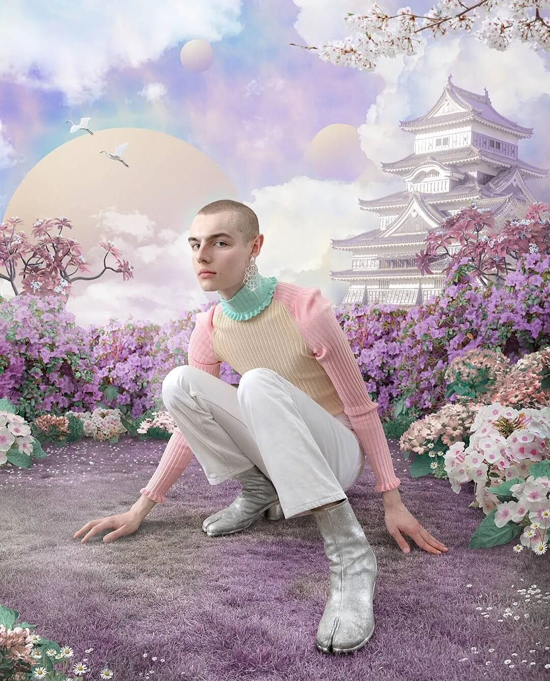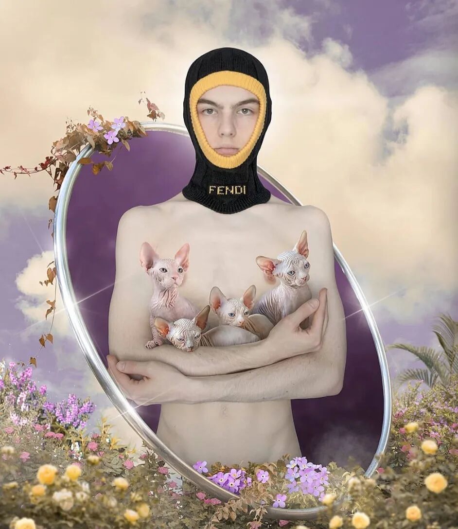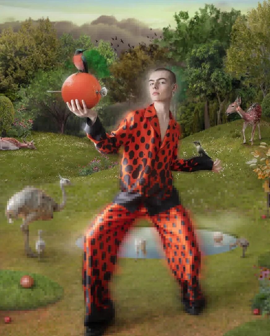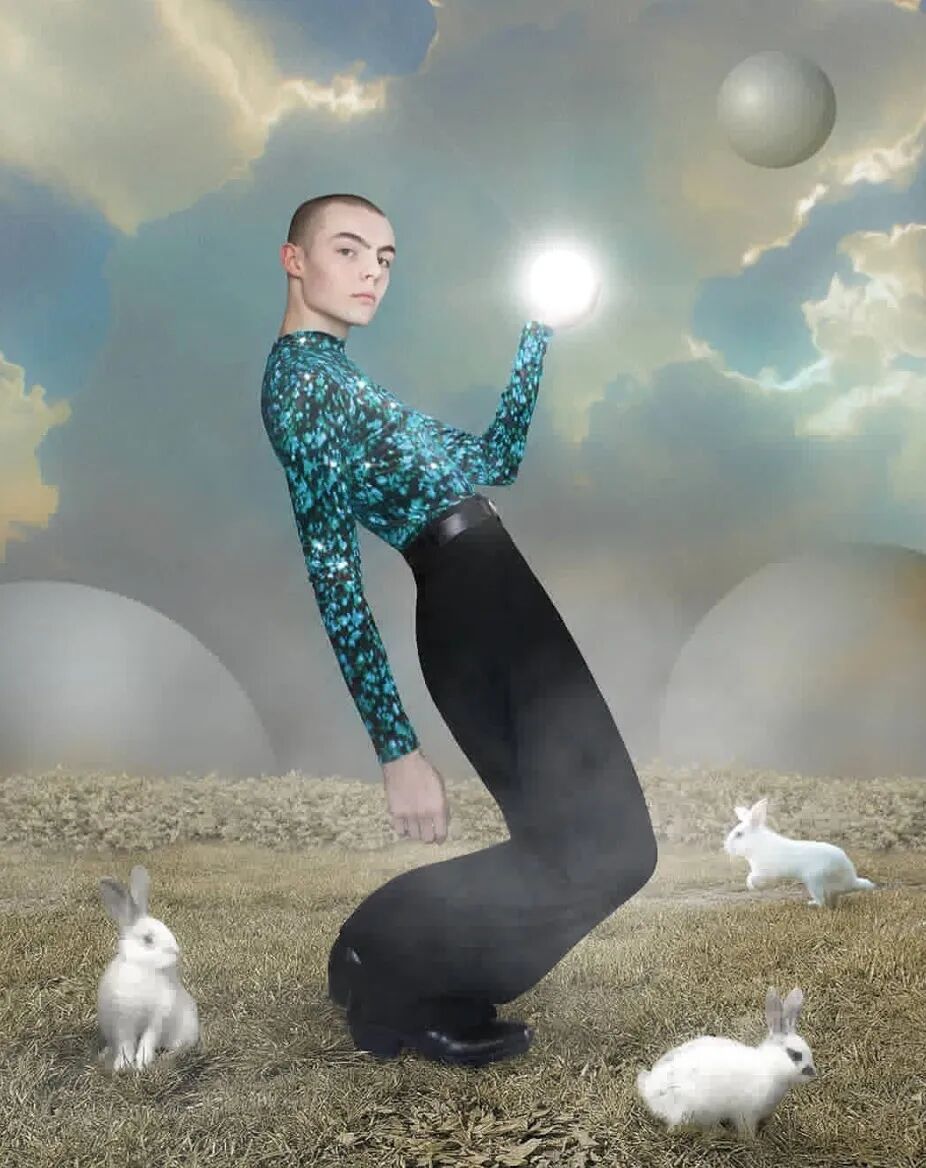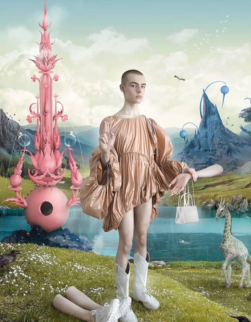 他自己也会作为模特,而且是以三头六臂,或是多胞胎兄弟同框出现在镜头前,天马行空的创意、梦幻又诡异的风格和超现实的创作手法让人一眼难忘,梦幻中带着半复古半未来的基调。