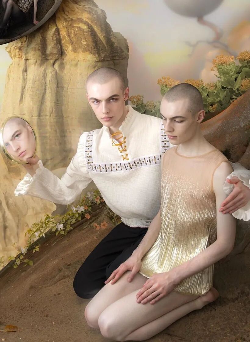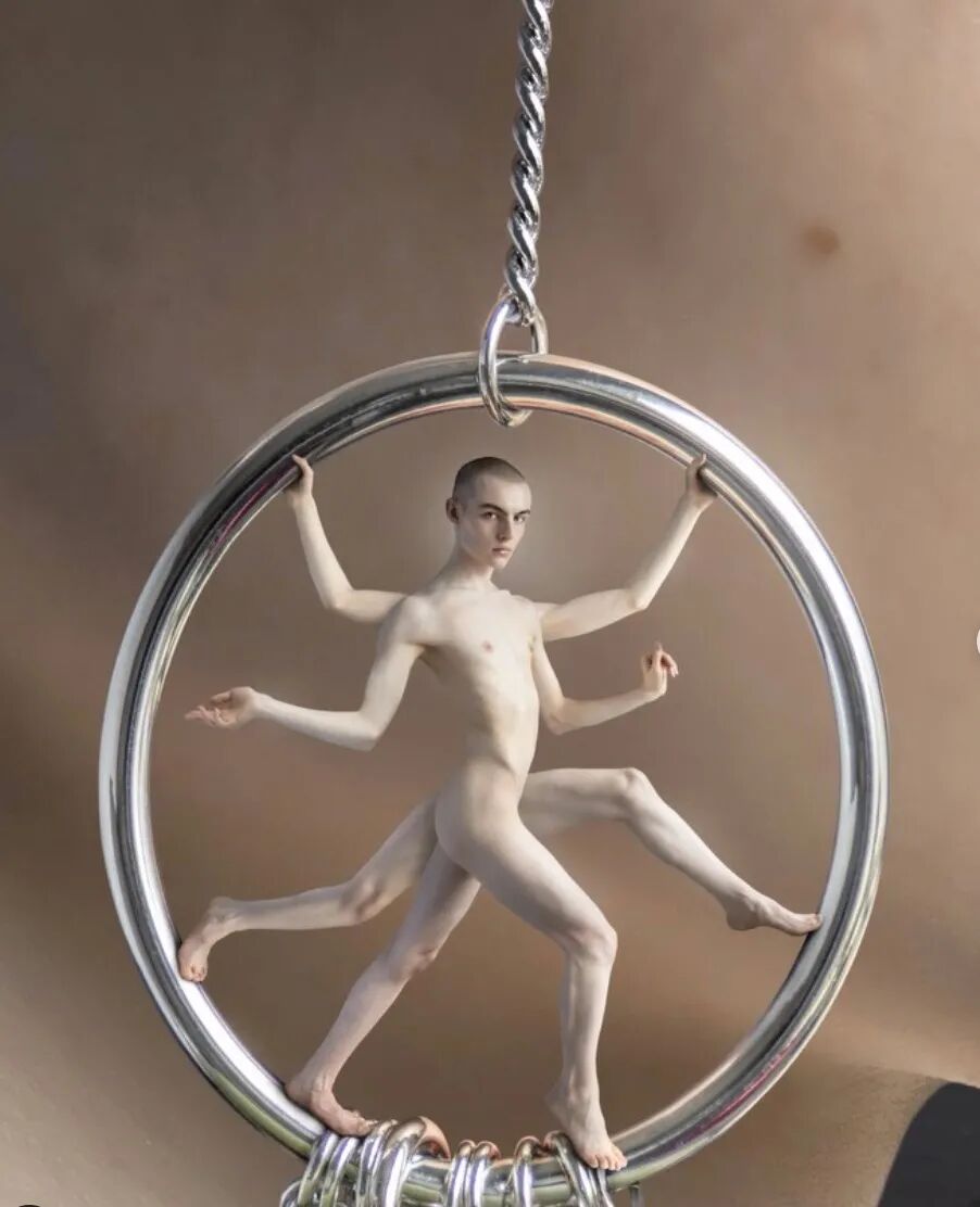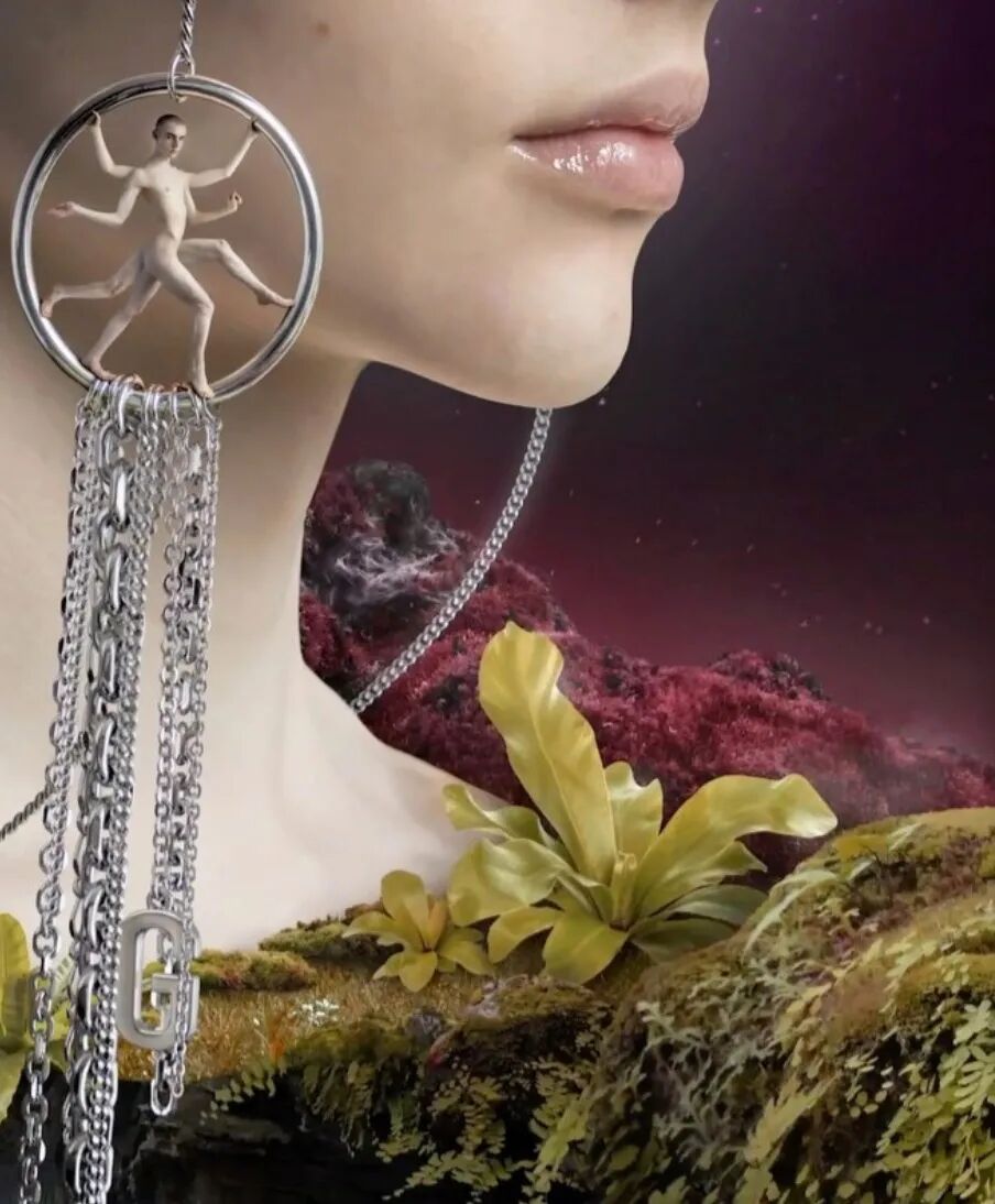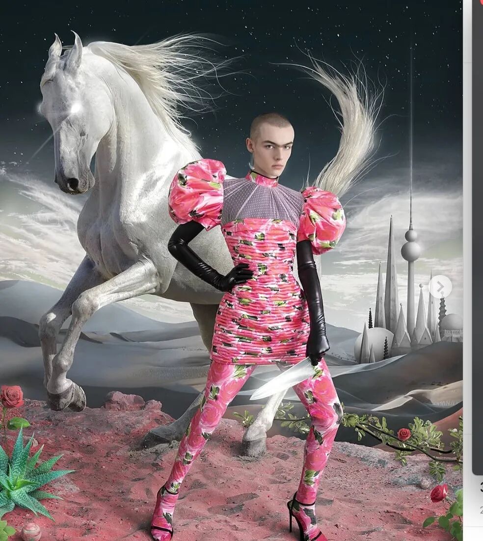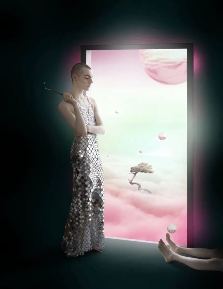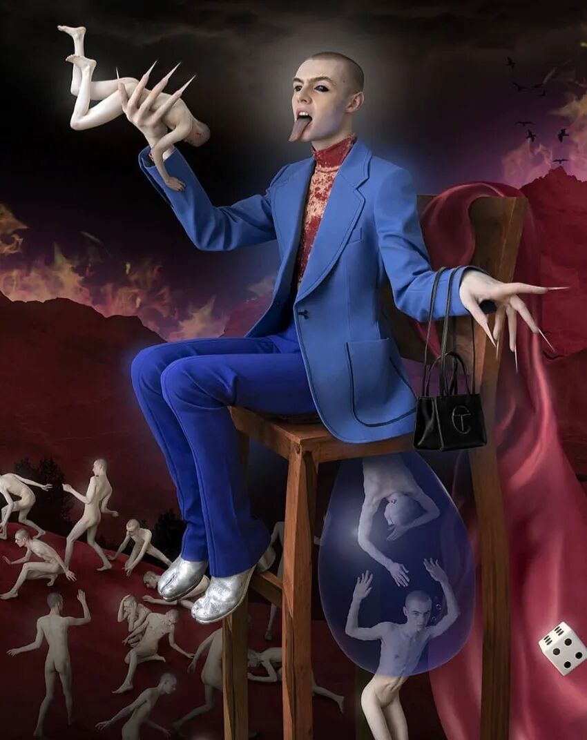 他自己也会作为模特,而且是以三头六臂,或是多胞胎兄弟同框出现在镜头前,天马行空的创意、梦幻又诡异的风格和超现实的创作手法让人一眼难忘,梦幻中带着半复古半未来的基调。
