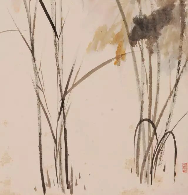 荷杆在画中也尤为重要,等于房子的梁柱,从画幅底部直贯而上,一气呵成,粗细有度,婉折绰约,顿挫有势,亭亭玉立,杆上再打点,上下交错,左右揖让。荷杆的周围,张大千别有用心的再添上几笔水草,既与荷叶相呼应,亦使画面更具层次感,更显画面的丰富与生动。整幅笔墨率意,情趣盎然,呈现出了荷塘的无限韵致。