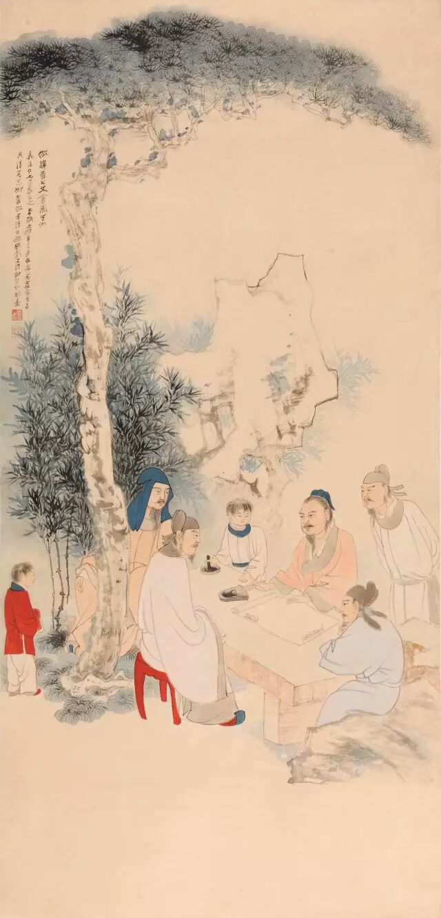 此幅《文会图》创作于1941年,画中人物神情、动作的刻画各各宛然,历历在目,而长幼尊卑、西宾东主则一目了然。背景中各种树木的安排则似经过精心考虑,与人物皆一一呼应,古松对应操翰长者,而竹之类则对应其它各人。同时,为了增强画幅的动势并打破构图上的过于规则,古松顶上的两枝忽然向右下横斜,与画幅下端向左上横插的树干上下呼应,构成一个极为完满的意象系统。