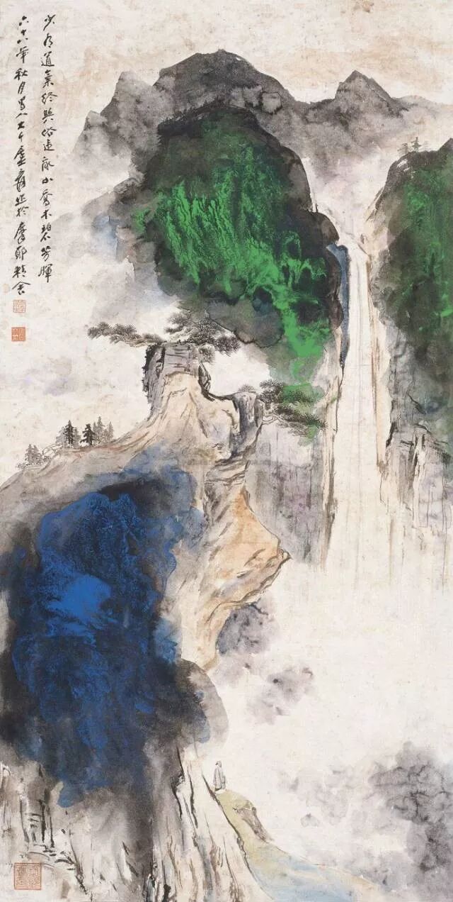 此幅荷花既含没骨写意,又施工笔重彩的画风,应为其施法古人,又自出机杼的创作。此幅兼工带写,叶茎当属胎息于青藤、八大、石涛的写意之笔,荷花则精雕细琢而成,风裳翠盖,墨叶纷披,红、白、绿、粉、蓝五色并开,缤纷绚烂,高华富丽。