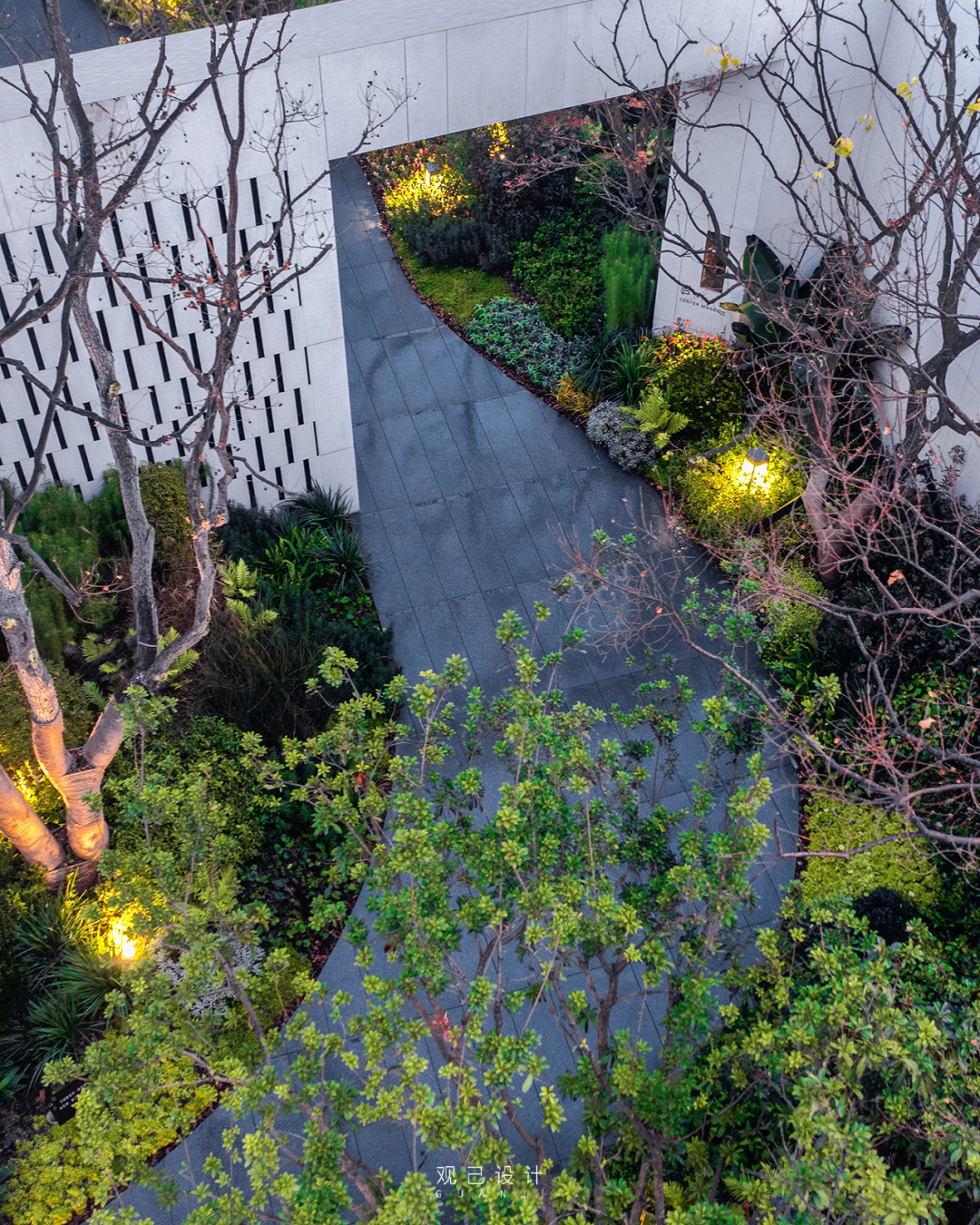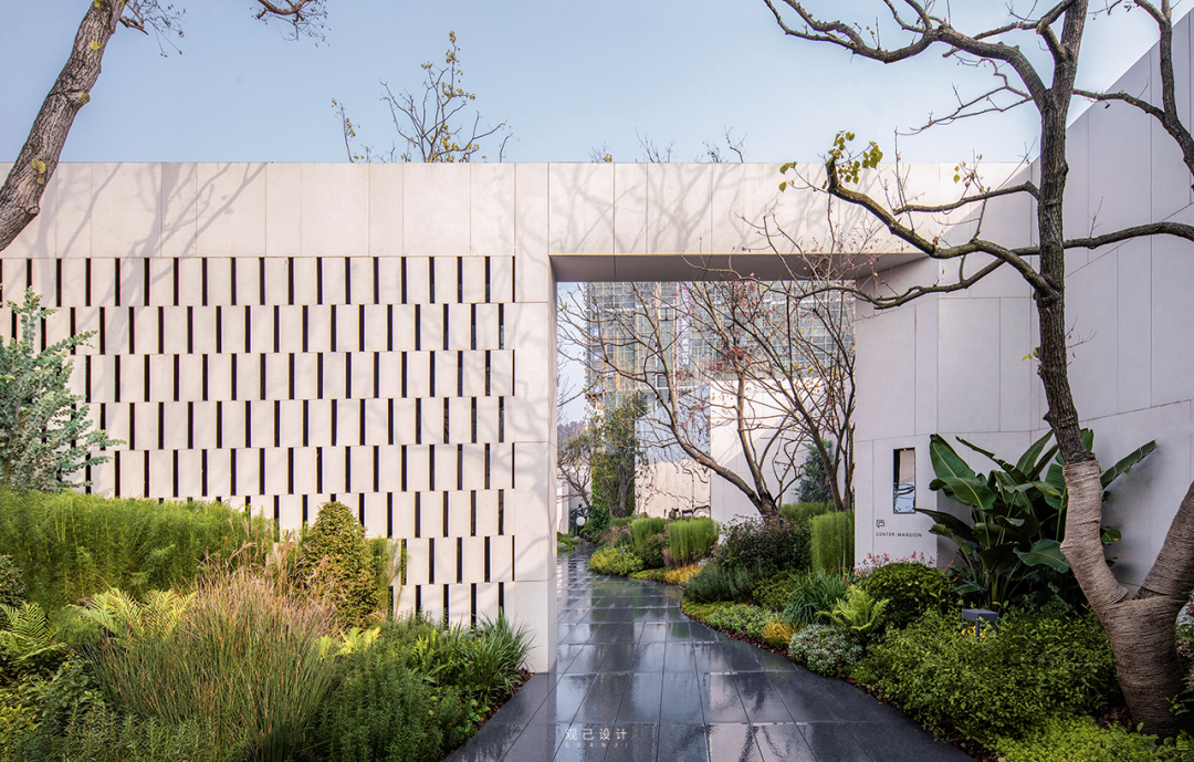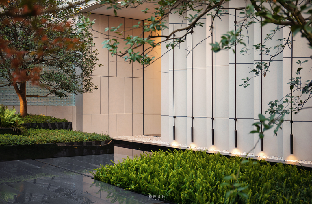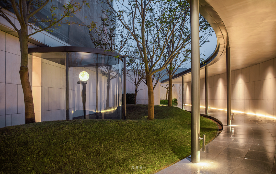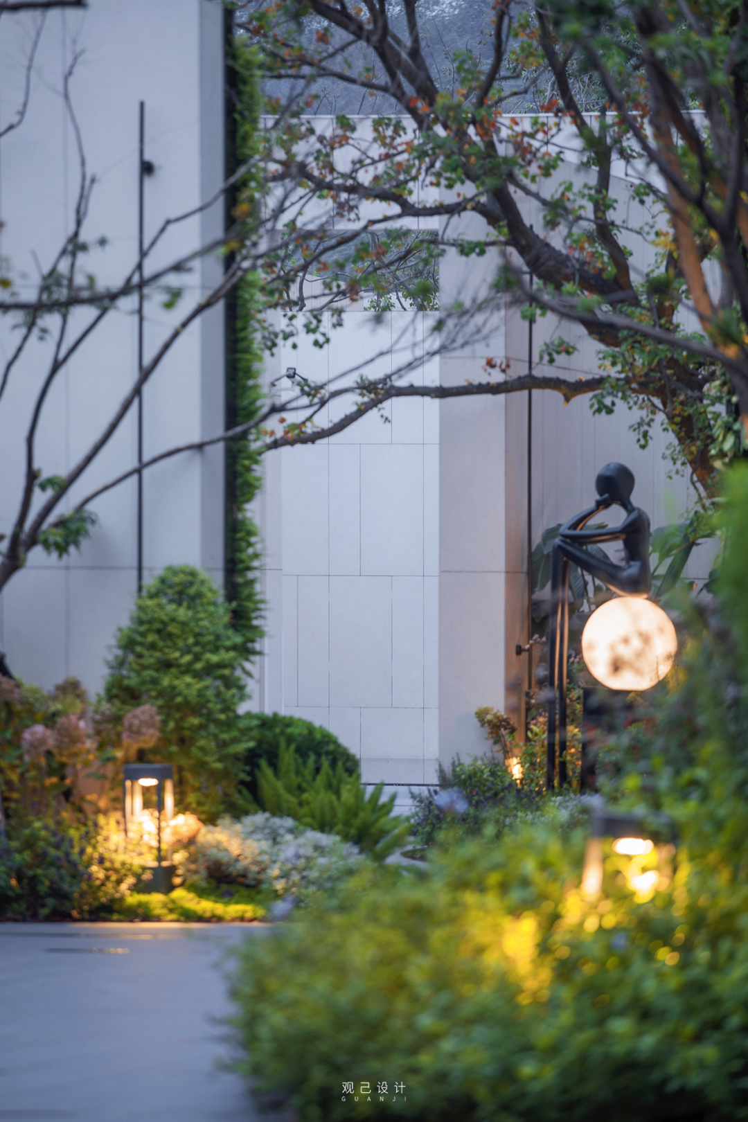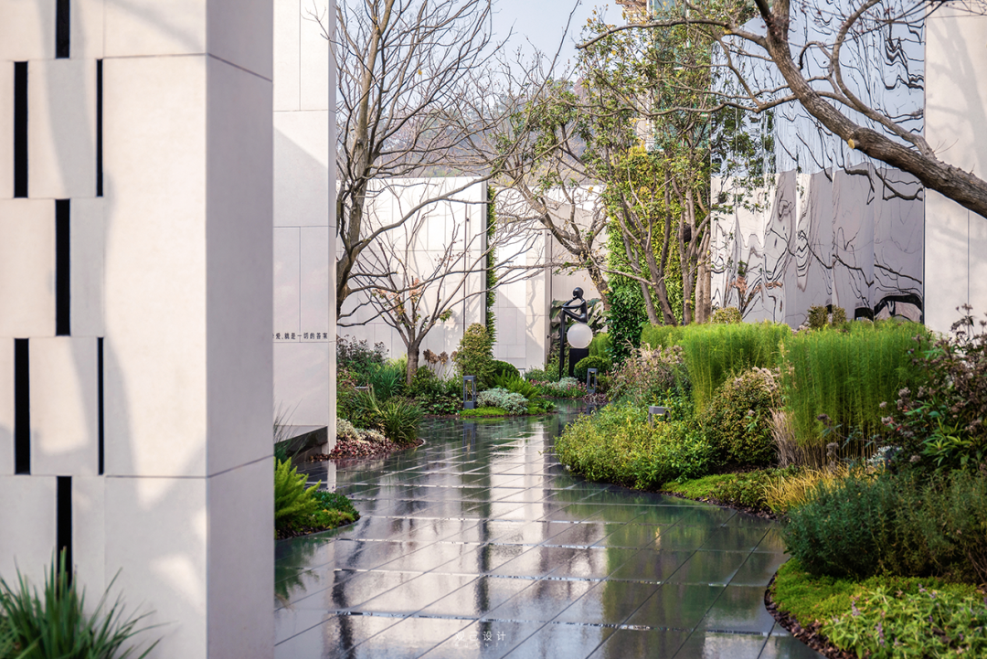 项目位于重庆渝北区,周边住宅云集,场地狭长、高差明显。针对这些场地条件,去设计区别于市场的产品及风格,打造差异化景观。在自然与艺术共生的艺术空间里,创造出极具戏剧张力的艺术沉浸体验,以及将现代精致美学艺术呈现其中。