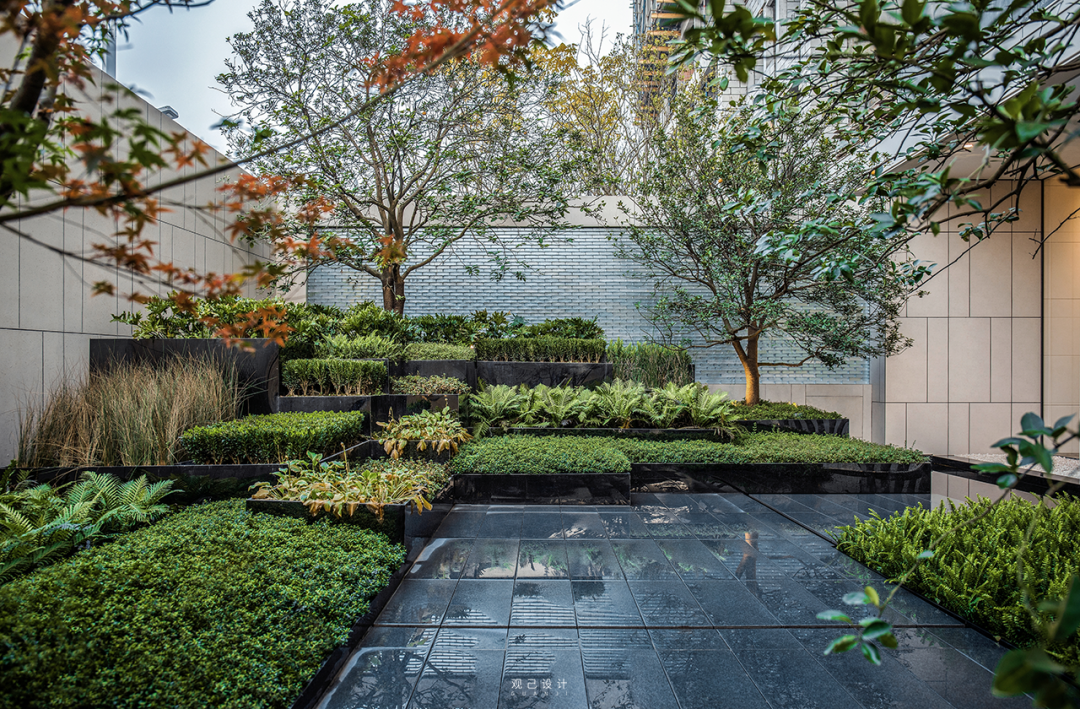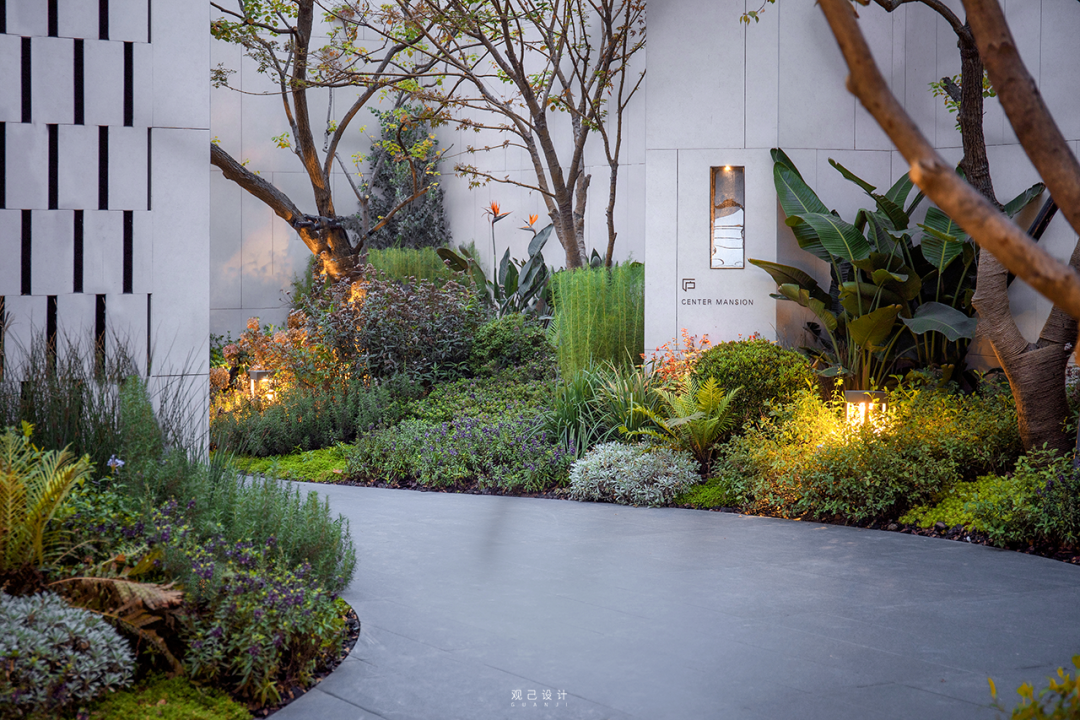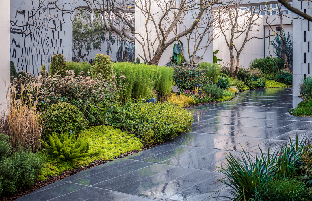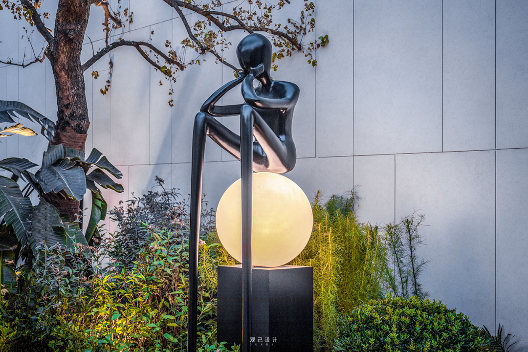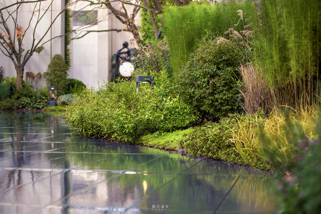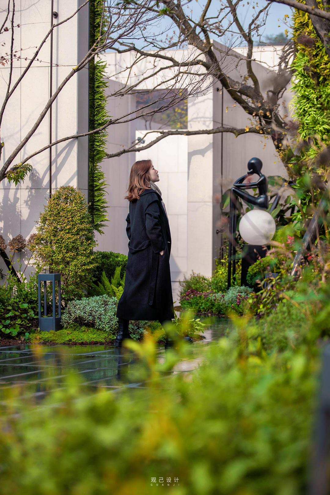 项目位于重庆渝北区,周边住宅云集,场地狭长、高差明显。针对这些场地条件,去设计区别于市场的产品及风格,打造差异化景观。在自然与艺术共生的艺术空间里,创造出极具戏剧张力的艺术沉浸体验,以及将现代精致美学艺术呈现其中。