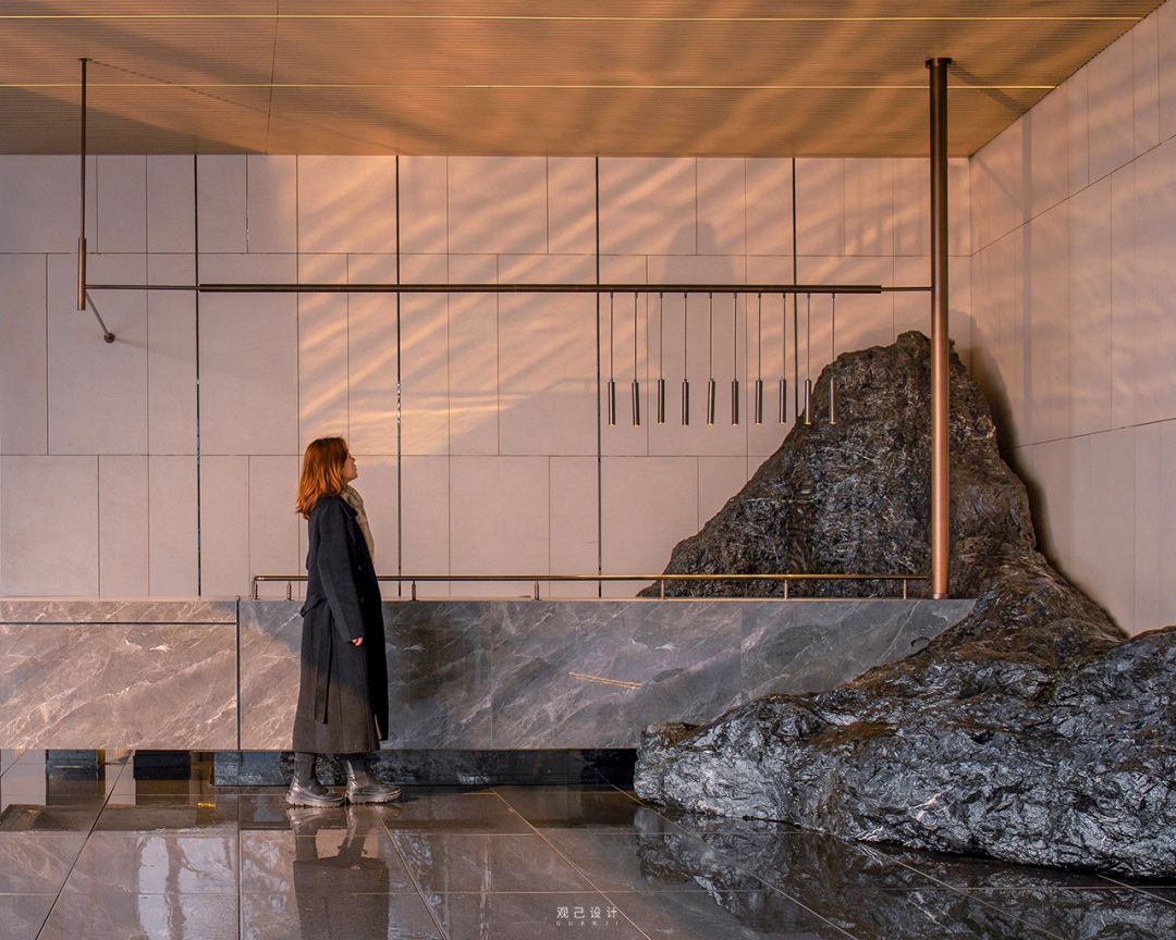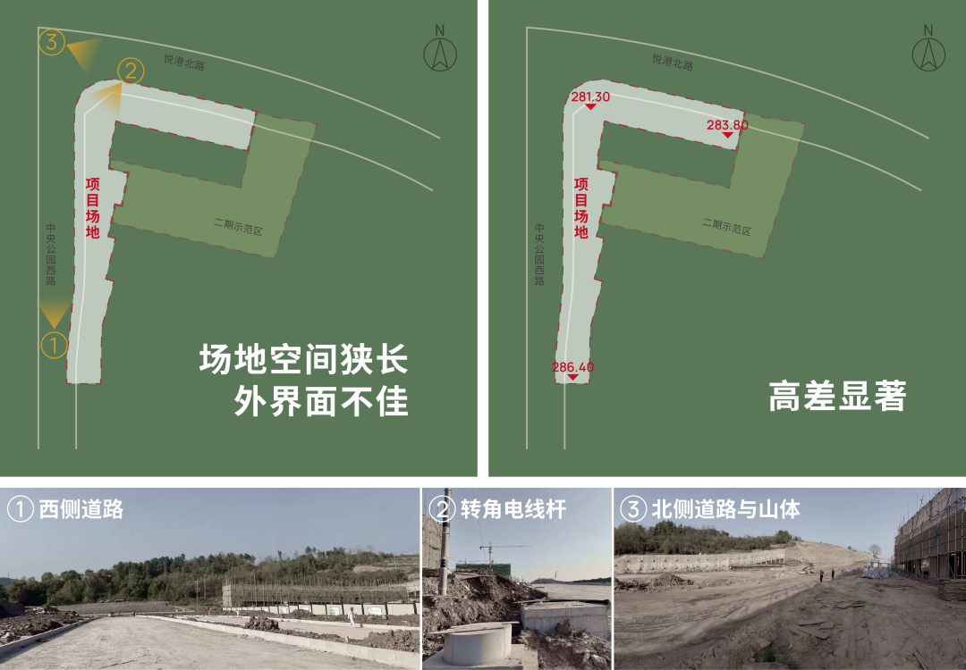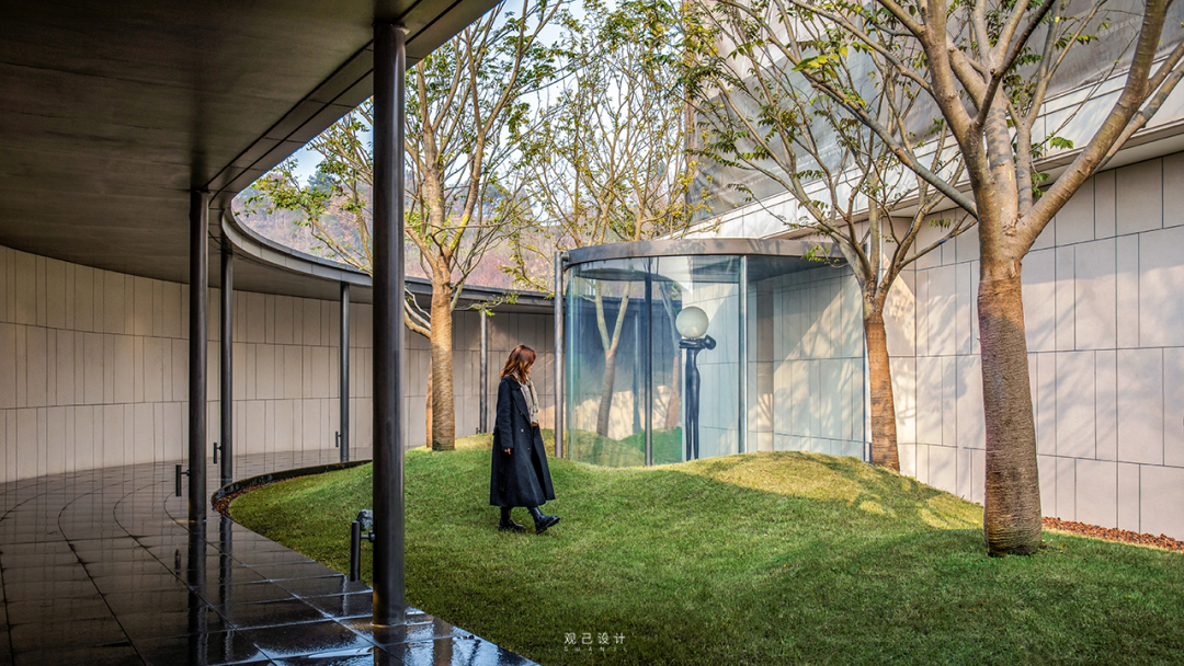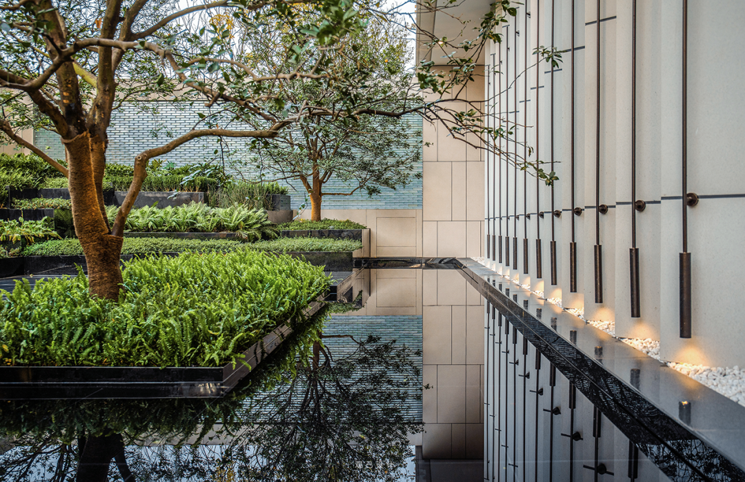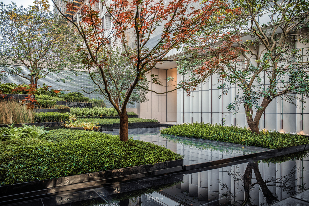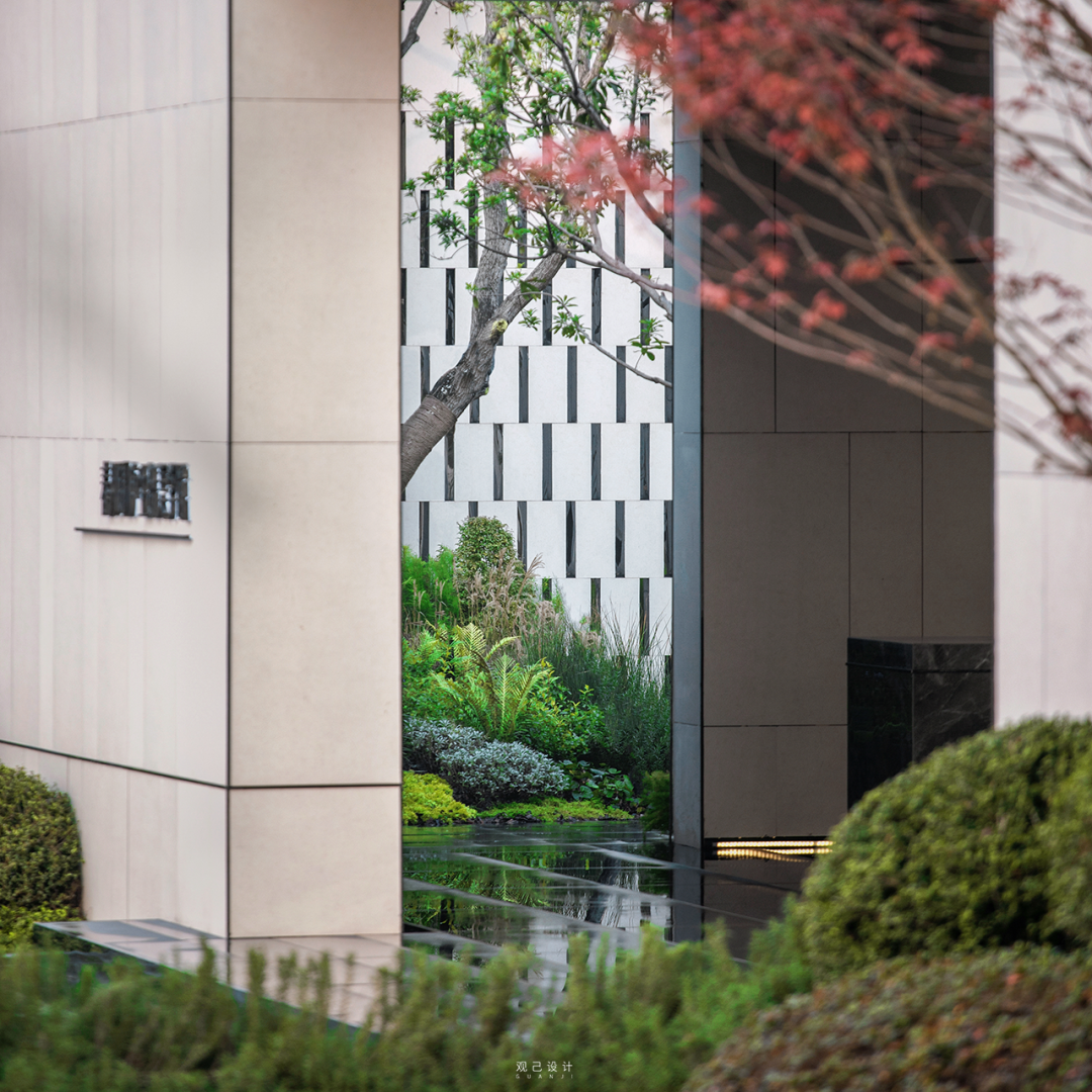 项目位于重庆渝北区,周边住宅云集,场地狭长、高差明显。针对这些场地条件,去设计区别于市场的产品及风格,打造差异化景观。在自然与艺术共生的艺术空间里,创造出极具戏剧张力的艺术沉浸体验,以及将现代精致美学艺术呈现其中。