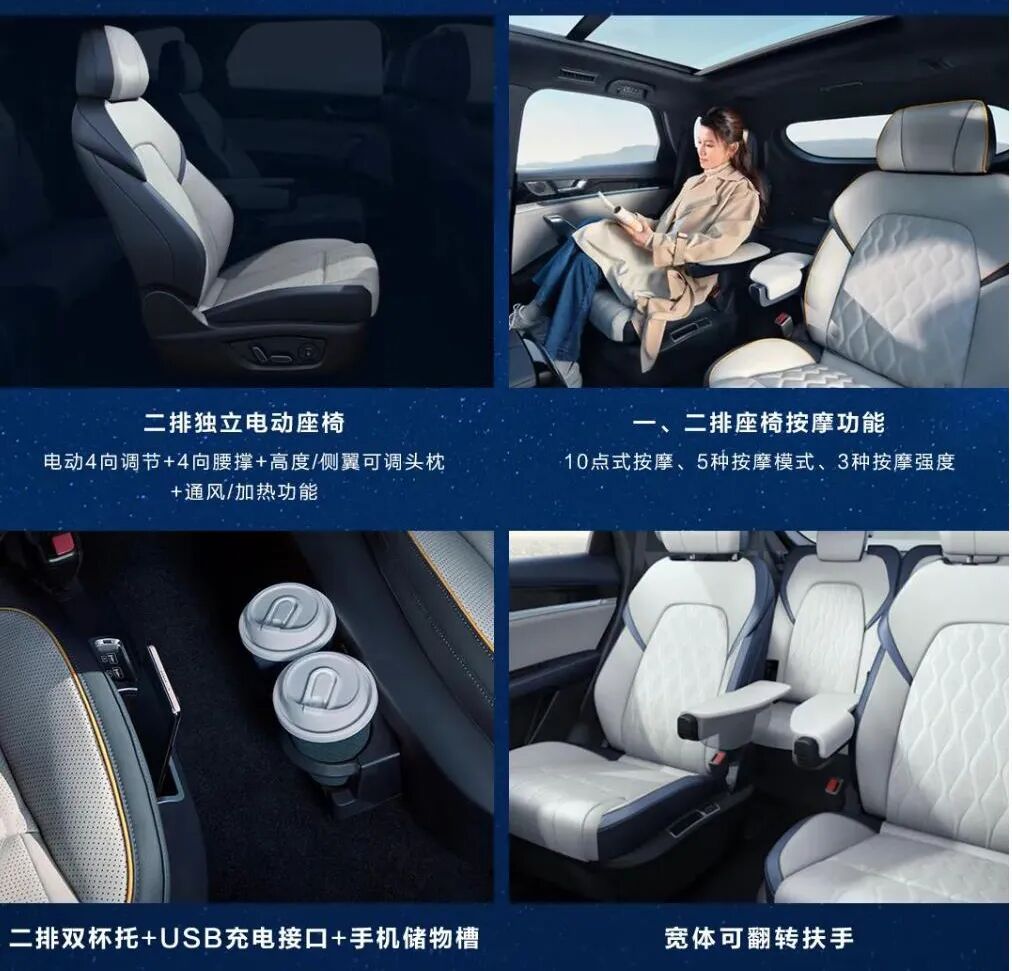 2022款唐EV吸引力之一就是内饰大幅升级,同时提供六座/七座选择,特别是六座版官方宣称“S级的豪华内饰”,第二排是独立电动座椅,NAPPA真皮、电动调节、通风加热和按摩等功能。