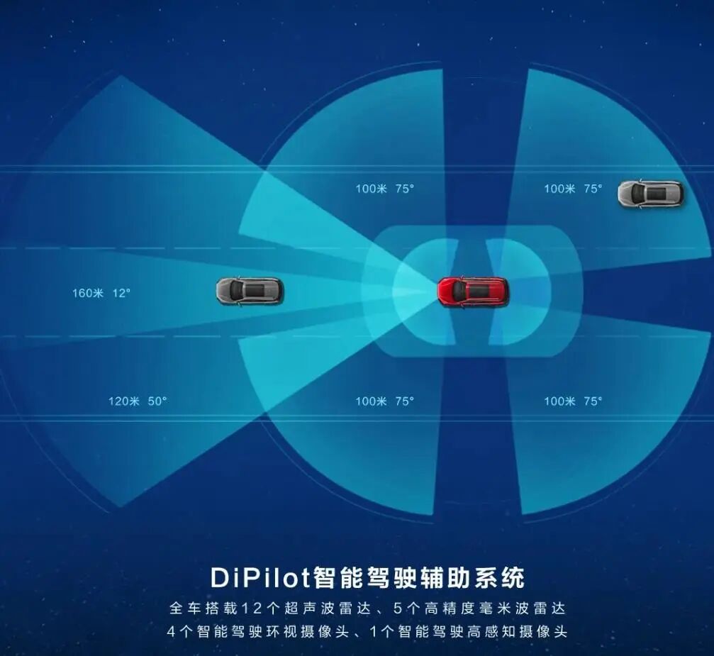 2022款唐EV 的DiPilot智能驾驶辅助系统则搭载了12个超声波雷达、5个高精度毫米波雷达等,全车拥有24个传感器。