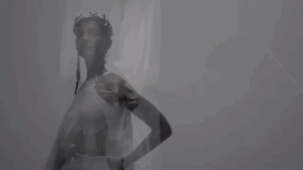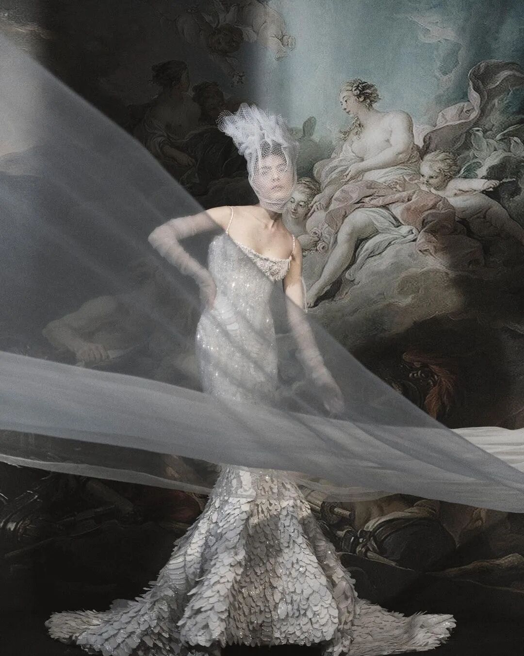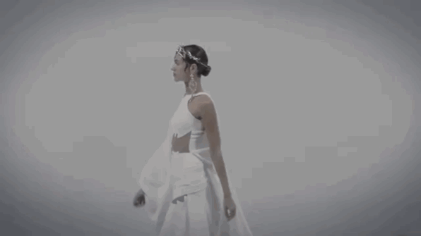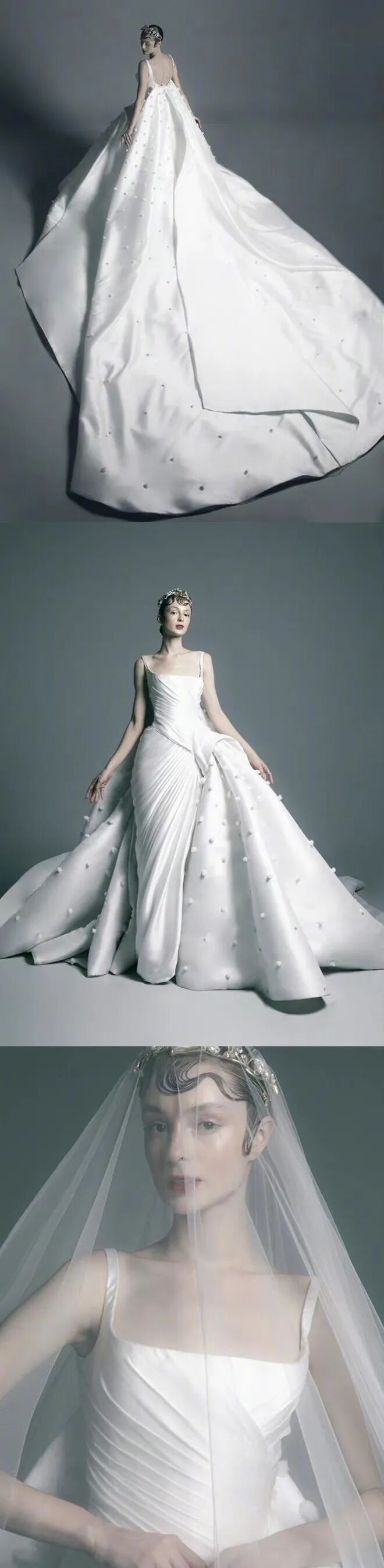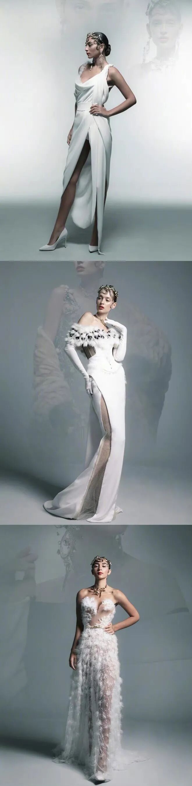 Nicolas Jebran还充分利用分割,让礼服的结构达到一种修饰人体的目的,高腰的分叉与轻薄的纱让麻豆增添了一种若隐若现的朦胧美。
