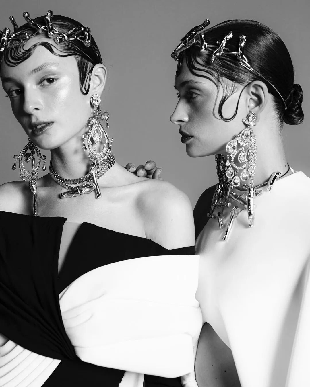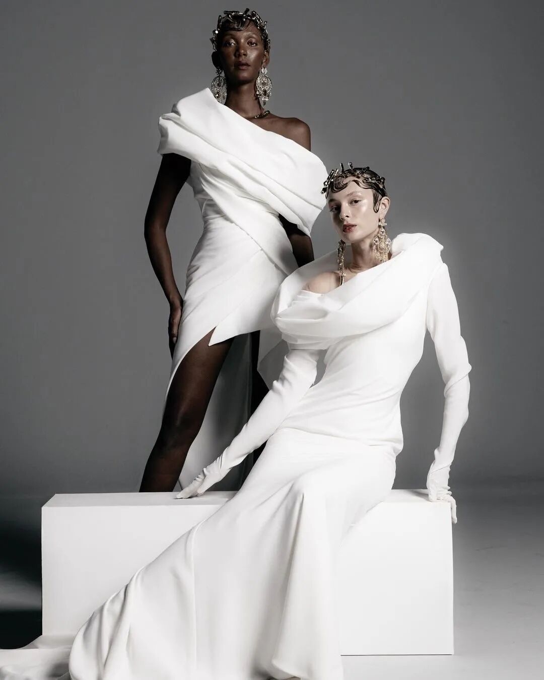 在款式上,Nicolas Jebran用立体裁剪创造出了许多不规则的结构,女性的曲线美从躯干蔓延到四肢。