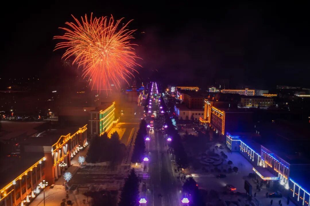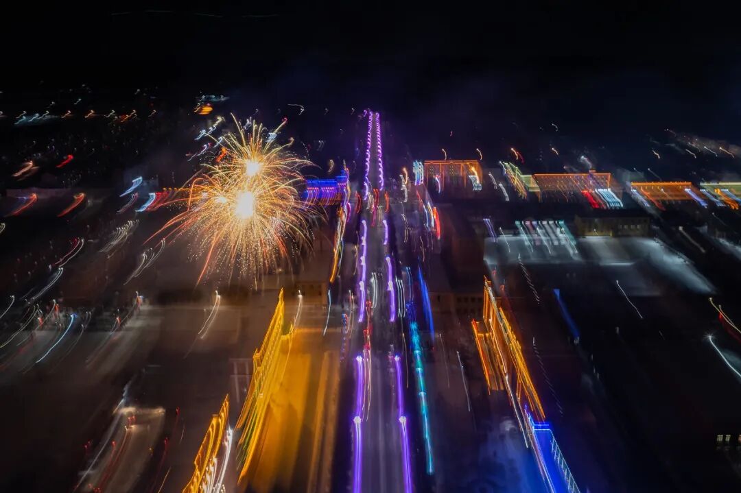 拍摄烟花实际上是慢门拍摄的一种,既然快门速度已降至几秒钟,我们可以拍摄烟花的同时,再拍摄地面上的车或人的行动的轨迹,也可以在长时间曝光的同时控制无人机小幅度的前后左右的摆动,让地面上的灯饰出现一种规律性的运动痕迹,营造一种梦幻的感觉。