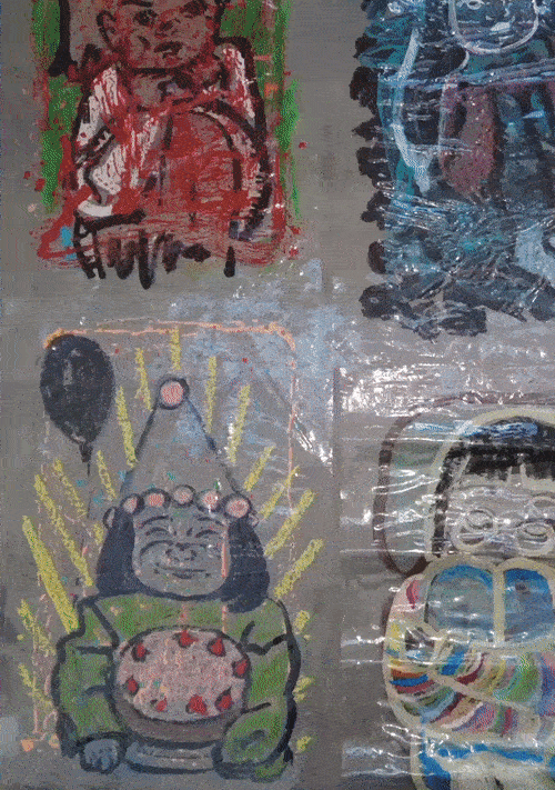 孙玛侬喜欢通过创作描绘儿童,从生活中捕捉一些无关紧要的事,寻找人物本身散发的某些情绪并在绘画的过程中将其放大。她的作品常常平铺在地面完成,把多种媒介当作画笔,试图强行给自己的创作添加一些不舒服,自由又失控的氛围。