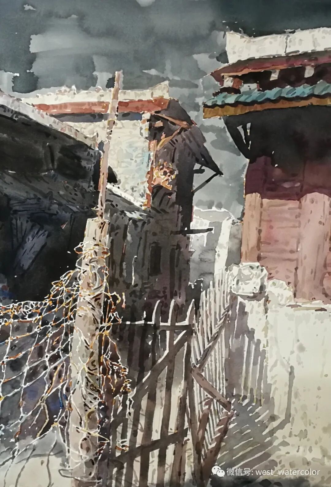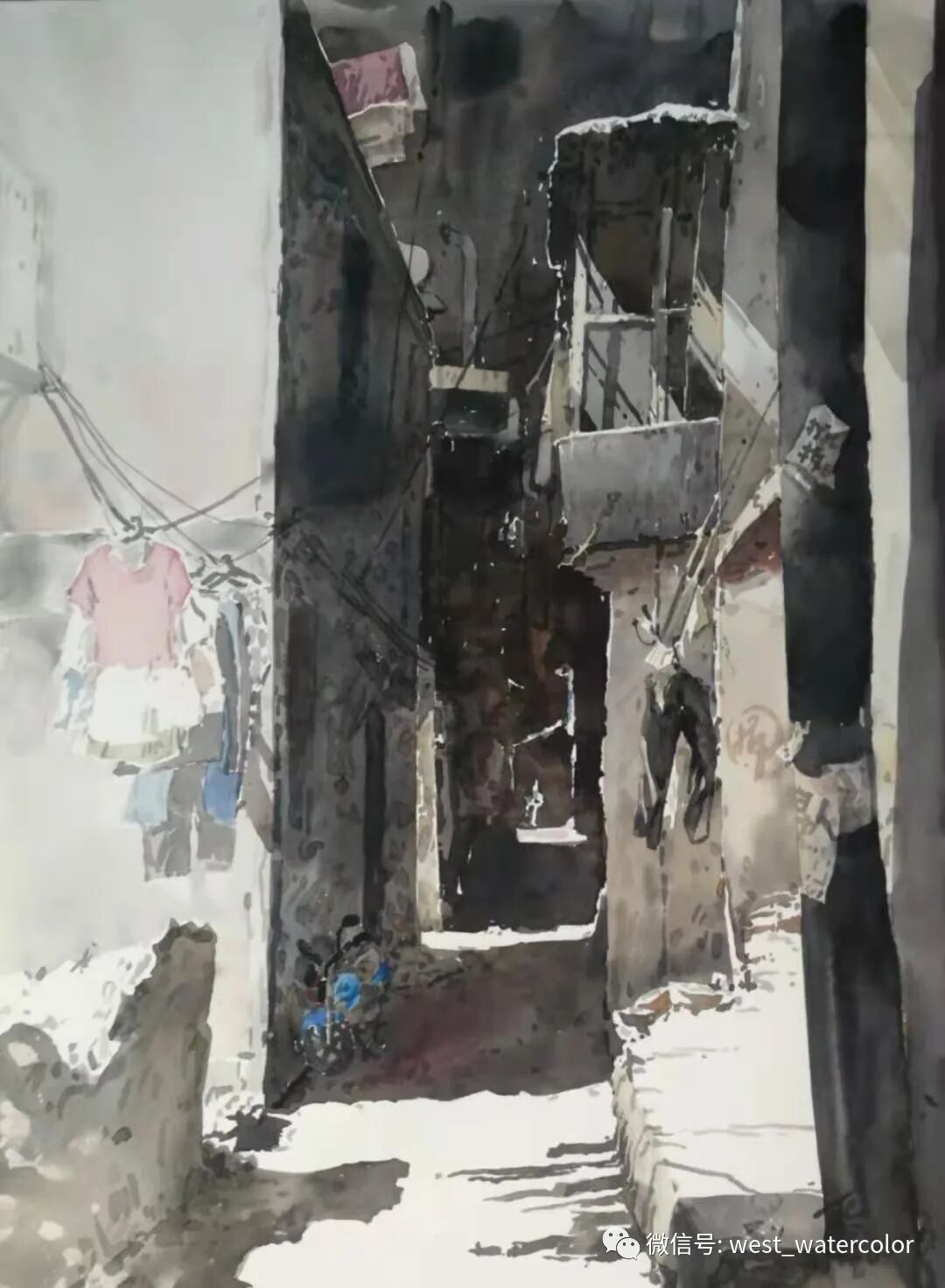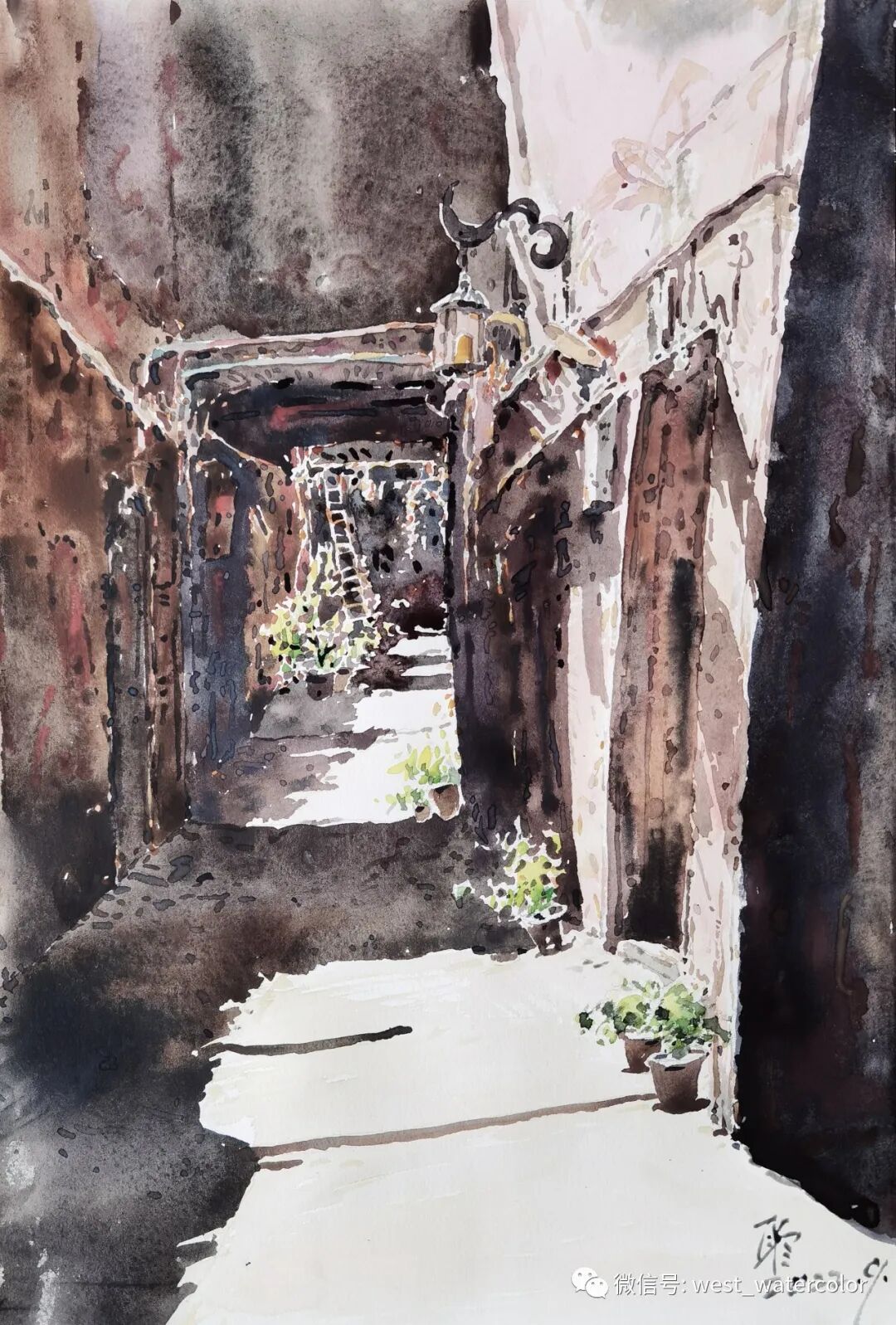 我喜欢水的智慧与柔韧,喜欢水彩画水色交融的韵味和酣畅淋漓的效果,那种虚实浓淡、流动转折又暗合着中国画的人文精神。一直在思考怎样将二者有机的结合画出中国特色的水彩画,让旧时光散发出现代审美的趣味,怎奈心有余而力不足。我喜欢画废墟、老房等老物件,是因为我喜欢那种淡淡的乡愁以及怀旧的冷峻,认同它们孤独、宿命、含蓄而丰富的色彩,它向我们展示了一个生命的过程,昭示着过去、现在与未来。人是怀旧的动物,所以每一次现代化艺术浪潮的到来都伴随着怀旧与返璞归真。我越画越觉得漂亮其实仅仅是审美的最低层次,真正的艺术美往往来自于苦涩与伤痛、平凡与细节。所以把最能触动我内心的元素蕴含进最平静的叙述应该是我追求的意境吧。