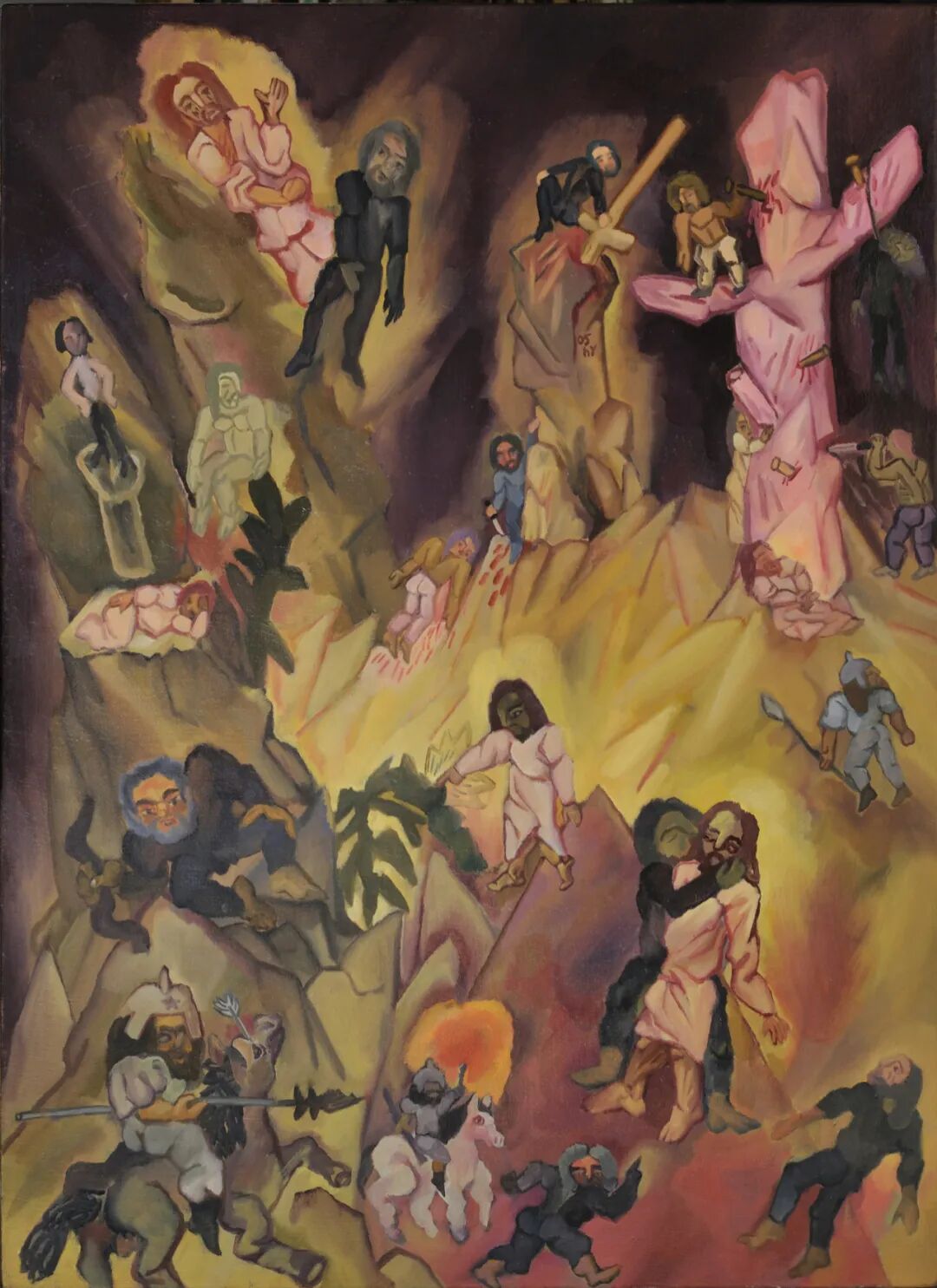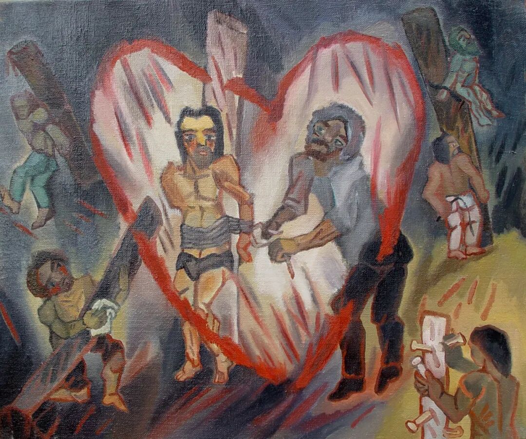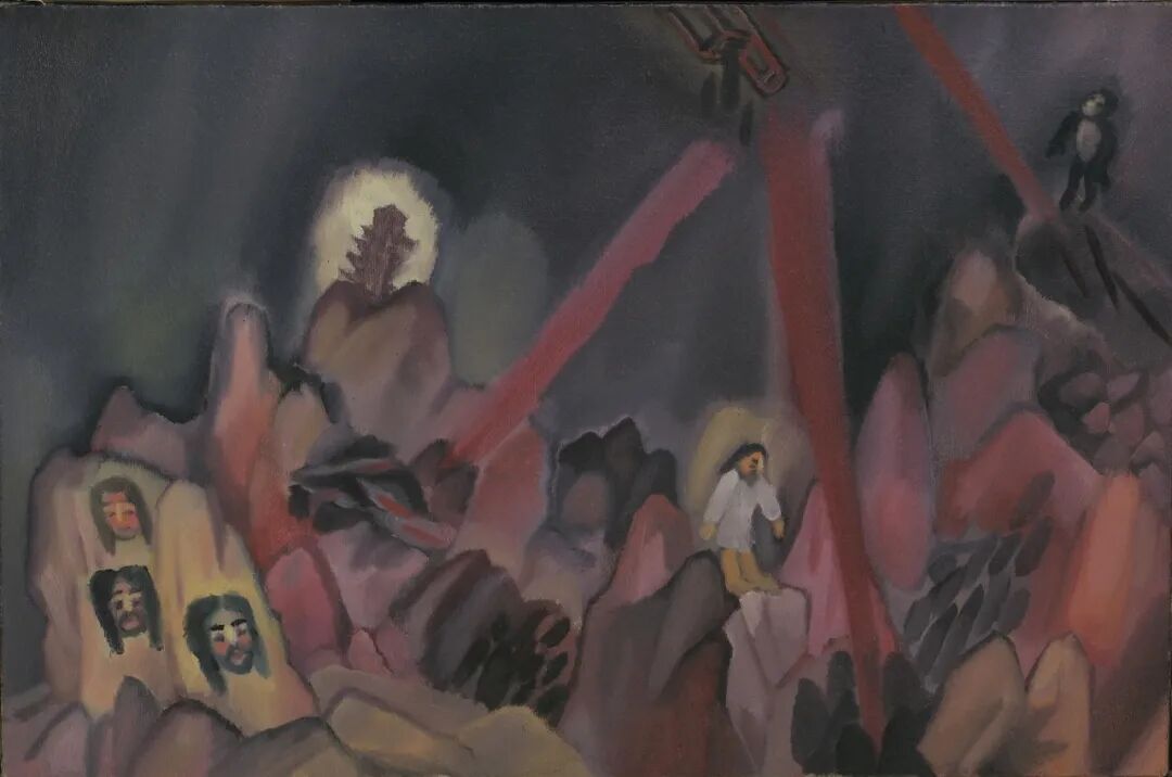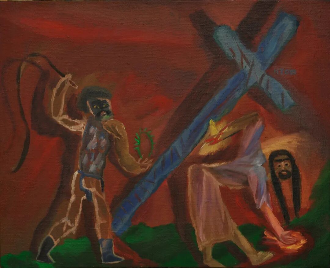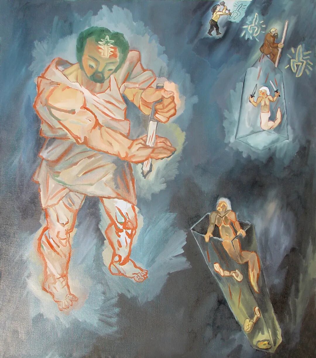 非常明显,他的大量画作都与圣经有千丝万缕的关系,有些直接就是他对圣经内容的个人化解读和幻觉化重撰,如2004年《鞭笞》、2005年《大爱》、2009年《诞生》、2009-2012年《晚餐》等,这一脉络延续至今。