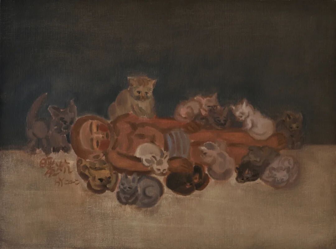 韩勇画室一角和他的两只猫,端午和豆豆 2021年