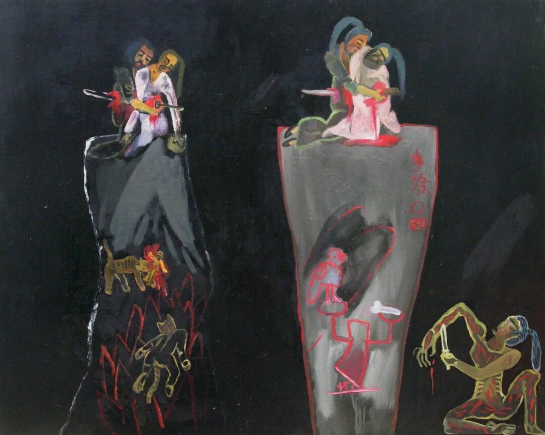他从这些经验中获得了某种启发,开始尝试在黑色背景上用“提亮”的方式勾勒形象,如2004年《割肉贸鸽》、2004-2005年《金发人种》、2005年《拉撒路》等画作,笔触遒劲、颜色厚实,肌理感也比较厚重,画面的节奏活泼。在这些画中,现代绘画的平面性趣味真正地开始觉醒,但对画面空间性的认识还有点青涩,从某种角度来说,他这时常利用黑色背景也跟把握空间感不自信有关。