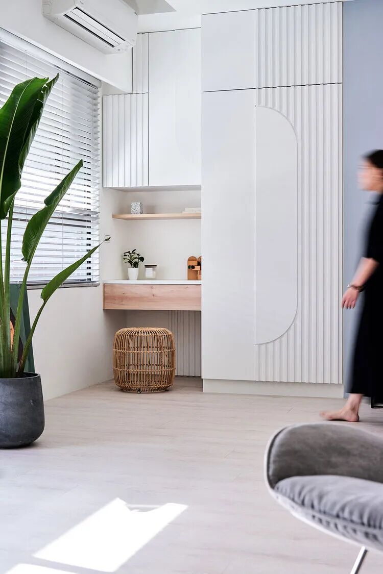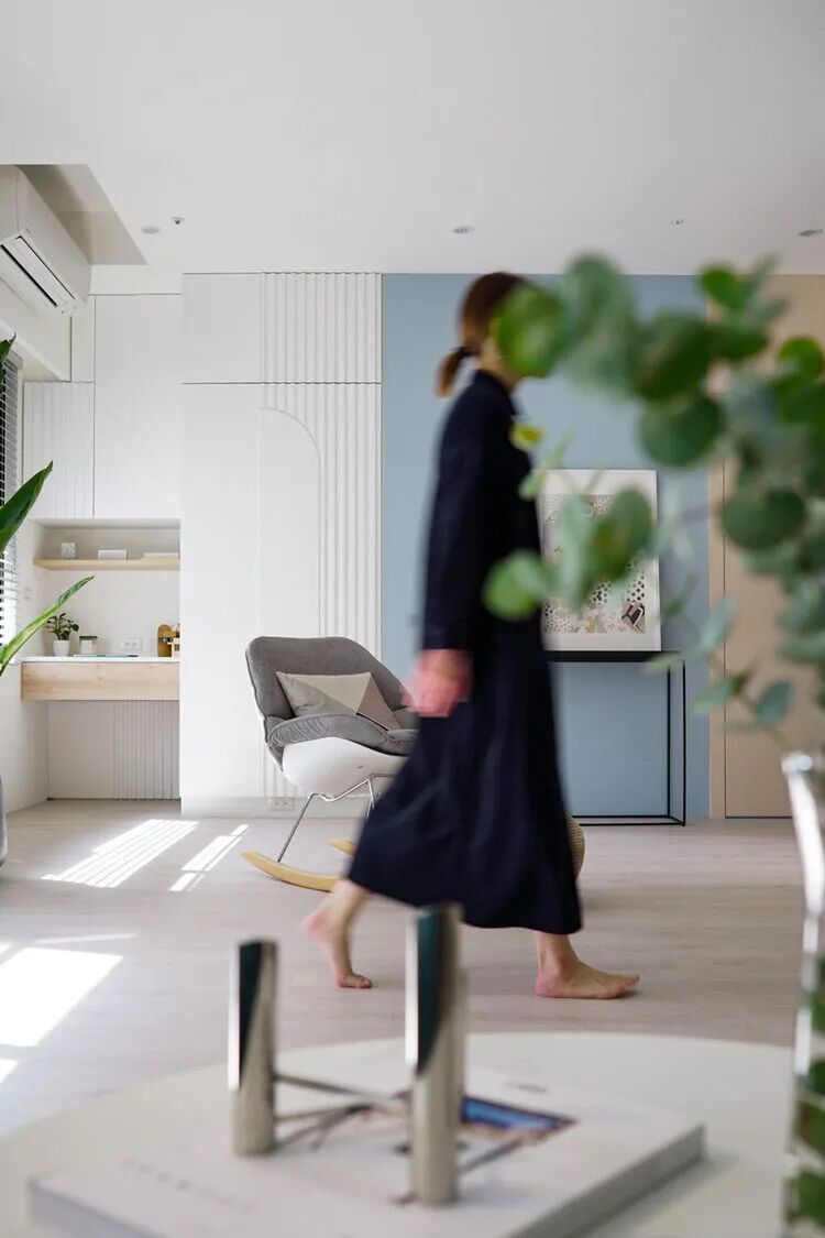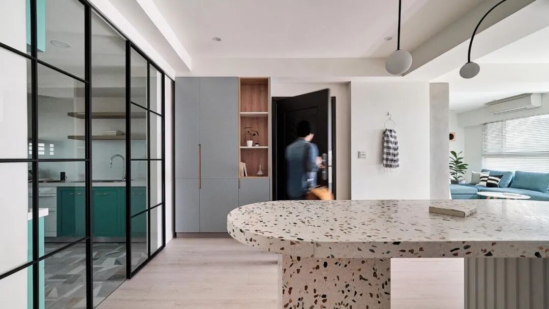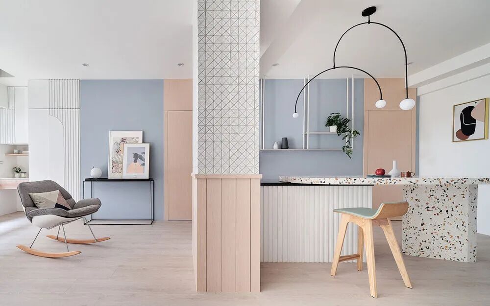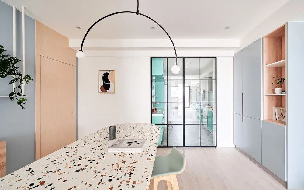 大自然本身就是一部翻阅不完的缤纷画本,从前至今,许多艺术家常从中被鼓舞,闪烁出创作的灵光,待将元素加以转译后,一个个不落俗套、令人怦然屏息的创作即迸发于眼前。 不知道你是不是也知晓,滂沱大雨后的天际,除了有广被作曲家和诗人引用为题材的彩虹,够幸运的话还能在彩虹的最外圈,发现一道彷彿被爱作画的天使淡然轻抹、隐约而朦胧的圆弧,科学上被称之为副虹,还有著一个更美的名字 一「霓」。重複端详霓的意象许久,深受其低调,却流洩出无限柔韵的样态所诱发想像的设计师,将霓似有若无的视感层次,细腻地倾注屋宅中,形塑一片静谧,直想徜徉于此的漂浮幻境。当我们走访里头,满盈的欢愉气味让人跟走在云端上一样地轻跳,一层又一层卸去现实的束缚,潜进虚实交织的光景。有那麽一刻,脑海裡倒映出斯洛伐克摄影师 Maria Svarbova 泳池系列作品,也想起了英国年轻艺术家 Charlotte Taylor 的画作,他们都是在极简的本质下,运用色彩与线条的接轨流动,营造多样化的几何语彙。若多驻留每个画面几秒,你将愈加感到时间宛如按下静止键,和光影一起,妥善地收折安宁且奇幻的氛围。如果可以住在梦里,那会是什麽样的感受呢?闭上双眼后的世界,又会有哪些有趣的现象发生?为了进一步衬托虚实之间的感受,设计师藉由重新铺陈空间佈局,掺入一点关于梦境的小幽默。他提到在梦中,我们常自由自在地下一秒就抵达其他地方,也很容易会有怎麽绕,还是回到同一处的情况发生,因此结合迴游的动线手法来描绘梦境常态,增添内部错综迷离的层次感。通透的开放式场域供居住者尽情漫步,享受无阻隔的开敞生活,依偎著结构柱的弧形中岛,则拉出三条隐形线,于无形中定义著不同的起居空间,更彷彿划分成多重的观景窗,交互捕捉人们在裡头来回穿梭的剪影。侧边依序列排的窗框,豪迈铺开欢迎日光及空气旅居的景致,而这两者恰好担任了成就空间意涵的鲜活要件。就如同要形成一道霓虹,阳光须在水滴内进行折射与反射作用;想彻底传达设计者的念想,也唯有当光线辗转洒落在所有设计细节身上,包含如云朵般的圆润滑线、大小柜体和砖瓦的精细纹理,陈列器物的人文质地,还有别于厚重,反倒显得可爱的水磨石材等,照映出清浅又明淨的透明气息,才能真正与日常调和,勾勒预想中的唯美况味。显现著霓虹调性的空间,装载的想像大小远超乎地坪的量尺刻度,除了拥有嚐起来微甜、悠然舒惬的生活梦想,还添加一份真切的祝福和隐喻 一 希望身置屋子裡的人们,无论今天过得是好是坏,在你回家时,一切都将雨过天晴。