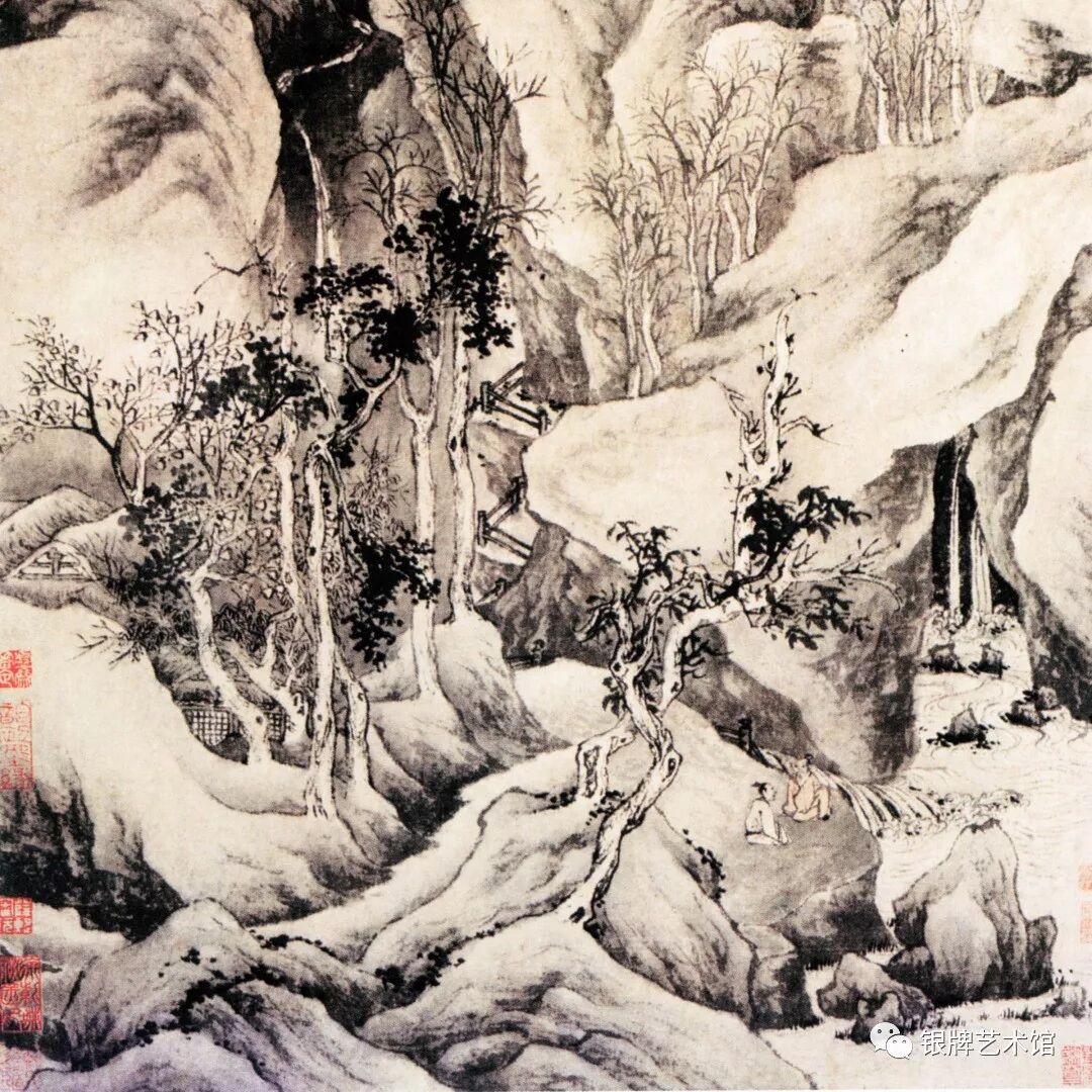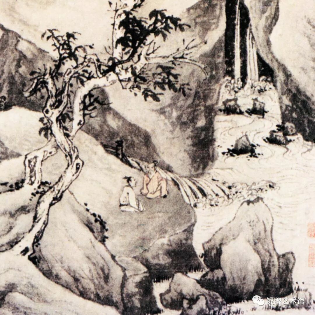 此图全用水墨,仅一叟衣袍醮以淡红色。