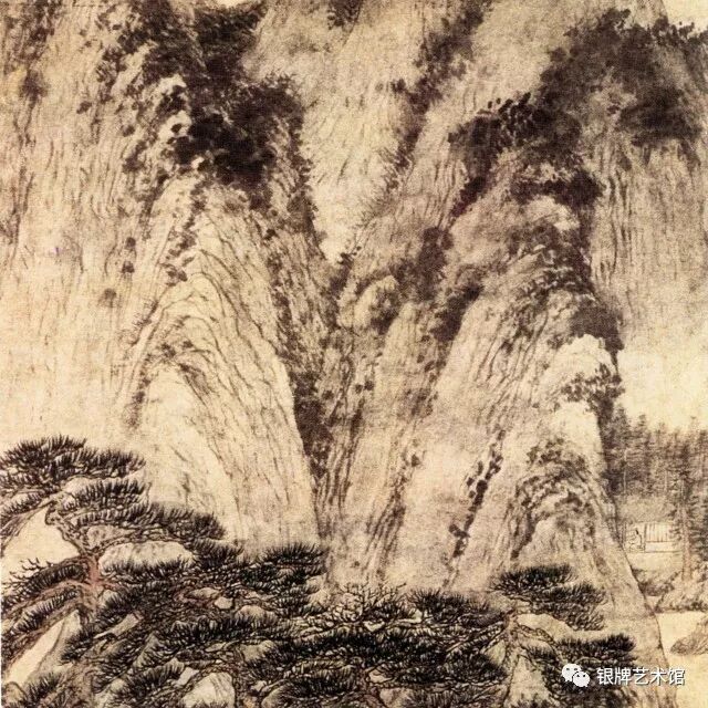 这幅作品完全是用短促、干涩且多为解索皴的笔触完成的,绝无王蒙以往惯用的渲染和丰富的皴擦。