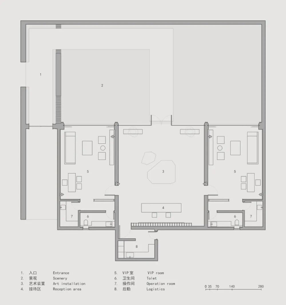 VILLA接待空间,在规划和功能属性中,运用“亭”的概念雕琢,两个“亭”的存在如同叠套而成的两个盒子。