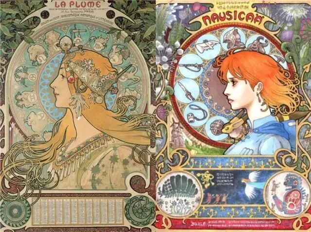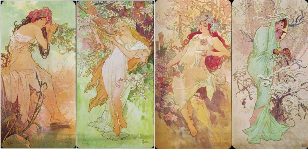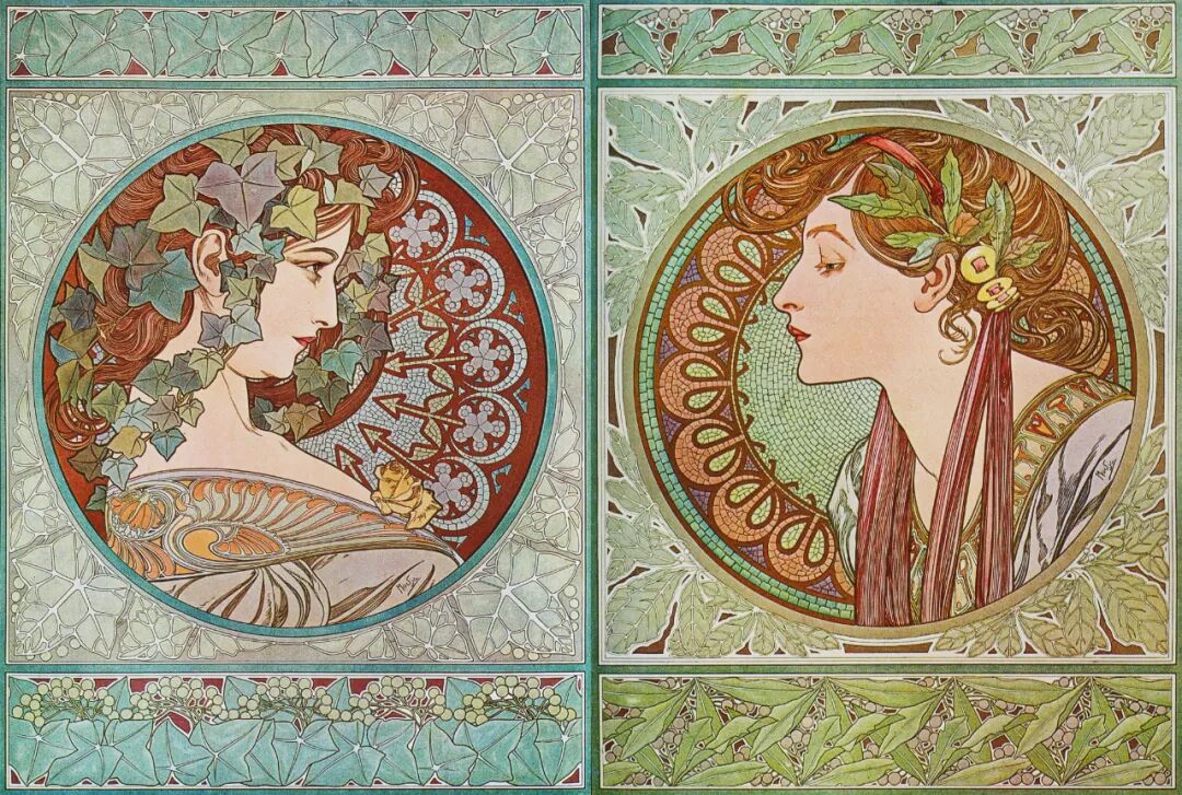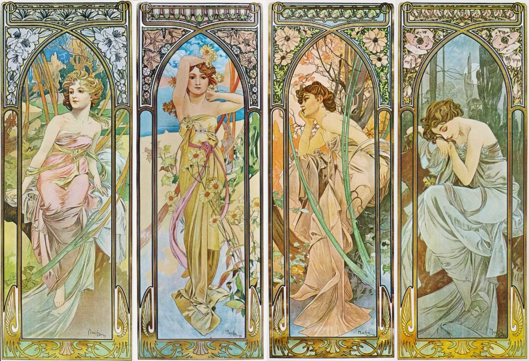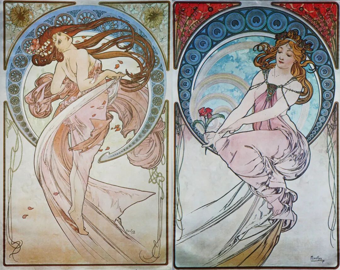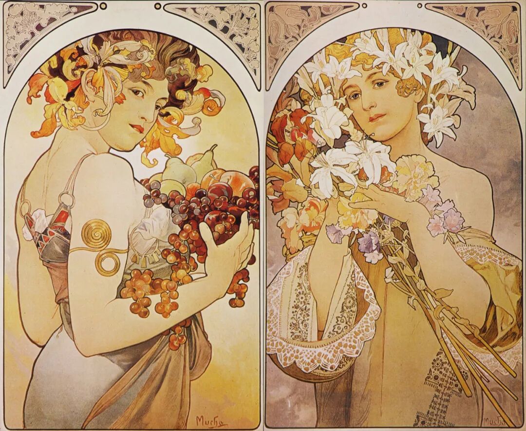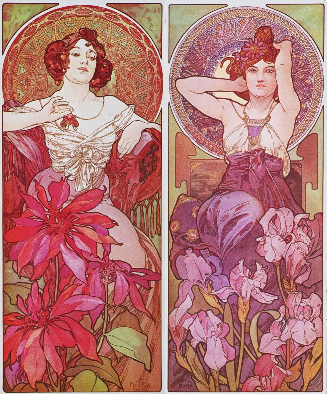 最新文章2024-01-07 纯欲少女,迷倒万千直男!这些极品美人竟出自一位“硬汉”之手! 有这样一位画家 明明是欧洲人,却被誉为“日本动漫鼻祖” 明明绘画出身,却成为珠宝设计界“扛把子” 明明是硬汉,却爱画娇媚迷人少女像 阿尔丰斯·穆夏 一个广为人知却又鲜为人知的艺术家 新艺术运动的捷克创始人、广告插画带头人 随便一个身份都足以令他名声斐然 但在美术史书中却难寻他的身影 如今,随着国内巡回展览的增多 已离世82年的穆夏摇身成为新晋网红 唯美华丽而不失力量的独特画风 吸引观者想要对他了解更多…… 学画之路,道阻且长 有人说与梵高、米勒这些名家相比,穆夏要幸运的多,在困苦时期总能有贵人相助。 但对于这位在时代夹缝下成长起来的“小人物”,象君更愿用“自助者天助”来形容他跌宕起伏的一生。 1860年7月24日穆夏出生了,那时的捷克共和国还未成立,处于民族解放的动荡之中。 因父母是虔诚的宗教徒,穆夏打小就耳濡目染了许多文艺复兴时期的教堂穹顶画,精美绝伦的女神画像让他着迷,埋下一颗学画的种子。 细看其代表作《四季女神》与波提切利(文艺复兴大师)的《春》,无论是细腻流畅的线条,还是柔和清丽的色彩,皆有几分相像。 曼妙的肉体,表达出充满人性的神像。 但因家境贫穷,一直没有机会接受专业训练的小穆夏,只能在唱诗班中自学绘画。 教堂中留存的华贵风巴洛克装饰壁画、雕塑,深深印刻在他的脑海中。 长期在圣洁气氛熏陶下,他之后的画作中不少女性都有一种光辉、温柔的圣母形象。 为了更好地提升画技,成年后他只身去到“艺术之都”维也纳。 白天在剧院打工,晚上在学校接受专业的美术训练,学院派画家汉斯·马卡特的装饰画风对其影响颇深。 边工边学的日子虽清贫,却很充实。 但一场大火烧毁工作剧院,打破了这种平静,他不得不流落各个地方以给人绘肖像、打零工为生。 花若芬芳,蜂蝶自来。 终于,穆夏的满腔才华受到爱德华伯爵的欣赏,出资赞助他前往慕尼黑、巴黎学画。 有人羡慕他运气够好,不用自己卖力赚钱就能享受好生活,冥冥之中失与得总有一个平衡杠杆。 这一时期,他的绘画虽更加成熟却难有新突破。 所描绘的多为甜美婀娜、柔媚动人,与人物周围流畅的植物花纹曲线相辅相成、相得益彰的仙女像。 逆袭为商业插画“鼻祖” 有钱人的任性你不懂,在穆夏过得最安稳之时赞助突然被停掉了。 有人说伯爵是为了督促他更独立发展,有人说是看腻了他的画。 就这样,穆夏又回归到穷困潦倒的生活,甚至连生病看医生的钱都没有。 为了生存下去,他接了大量的书籍、广告插画,边赚钱边提升自己。 此时因正处新艺术运动时期,东西方文化在巴黎相互交融,神秘新颖的东方风格受到热烈追捧。 穆夏对葛饰北斋、喜多川歌麿等大师的版画很是着迷,日本画强调的线条感和平涂用色,以及对世俗生活的表达,融入他的画作之中。 喜多川歌麿《姿见七人化妆 难波屋阿北》《当时三美人》 这种综合性的艺术风格,在代表作《黄道十二宫》中发挥得淋漓尽致。 《黄道十二宫》与日本插画家Takumi创作的宫崎骏动画人物插画 画中女主人公是女祭司形象,金色卷发,侧面示人,头戴拜占庭式的头饰和珠宝,身负黄道十二宫符号,被精致的叶形装饰包围着。 在宗教气息浓厚的氛围中,浮世绘色彩平铺的方式和柔和纯净的色调也得以体现,整体画面不受事物原色限制,一笔一色中表达自己对作品的感受。 当努力积累到一定程度,幸运会不期而遇,穆夏又遇到了人生中第二个贵人。 萨拉·伯恩哈特是当时法国大名鼎鼎的女演员,要演出的戏剧《吉斯蒙达》正赶上圣诞节,知名设计师都放假了没人做海报,在印刷公司万分焦灼之时,穆夏加班救场。 萨拉·伯恩哈特 近两米高的长条形构图,塑造了一个比真人更苗条的形象。 海报中的人物不仅身着华丽长衫,神采奕奕,还装饰上了宗教圣像画中常见的圆环装饰结构,让人瞬间变得崇高和神圣起来,整体上彰显个性和美丽。 作品一经面世便引起轰动,大家纷纷称赞太美,女明星开心的和穆夏签订六年海报合约。 一炮而红后,大量的广告宣传订单找上穆夏,从香烟、食品再到自行车,几乎都有涉猎。 Lefévre-Utile品牌饼干 就连演员佩戴的珠宝设计,都被他一一承包。 珠宝设计手稿与成品 更牛的是就连老上海月份牌中,皮肤白皙、身材丰腴的女性,都与他笔下女性有几分神似。 这种将广告、绘画、装饰、设计融合在一起的艺术风格,成为新艺术运动重要表现方式。 后来的日本漫画,深受其影响,生动诠释了民族的才是世界的。 穆夏同款美少女纱裙 快节奏的赶工、商业性质浓郁的创作,在让穆夏名利双收的同时,也陷入一种迷茫。 艺术为谁创作? “我的画,装饰着上流社会的沙龙,衬托上流社会的人。与此同时我的同胞为了解渴,却只能喝阴沟里水。我发誓,我将把我所有的创作献给同胞,直到生命最后一刻。” ——穆夏 在巴黎过着优渥生活的穆夏,想到处于战争中的同胞还在水深火热中,久久不能平息。 强烈的民族意识促使他放弃一切,离开巴黎回到故乡。 商业绘画对他已无多大意义,创作一个更宏大主题:“南斯拉夫史诗”,反应整个斯拉夫民族从史前到十九世纪民族苦难与光荣的历史。 为了全身心创作,穆夏独自搬到郊外创作,大大的草稿就画了几百张,工作量大到家人见他都