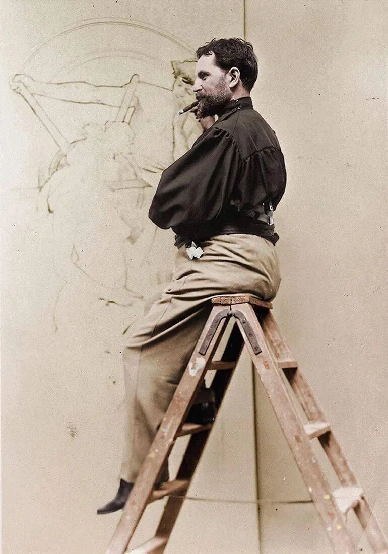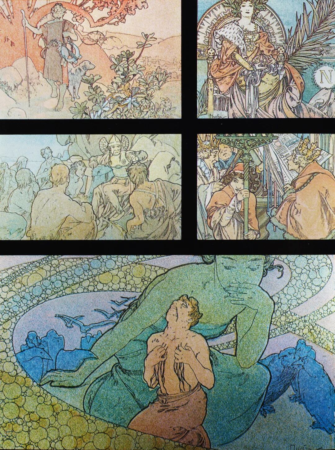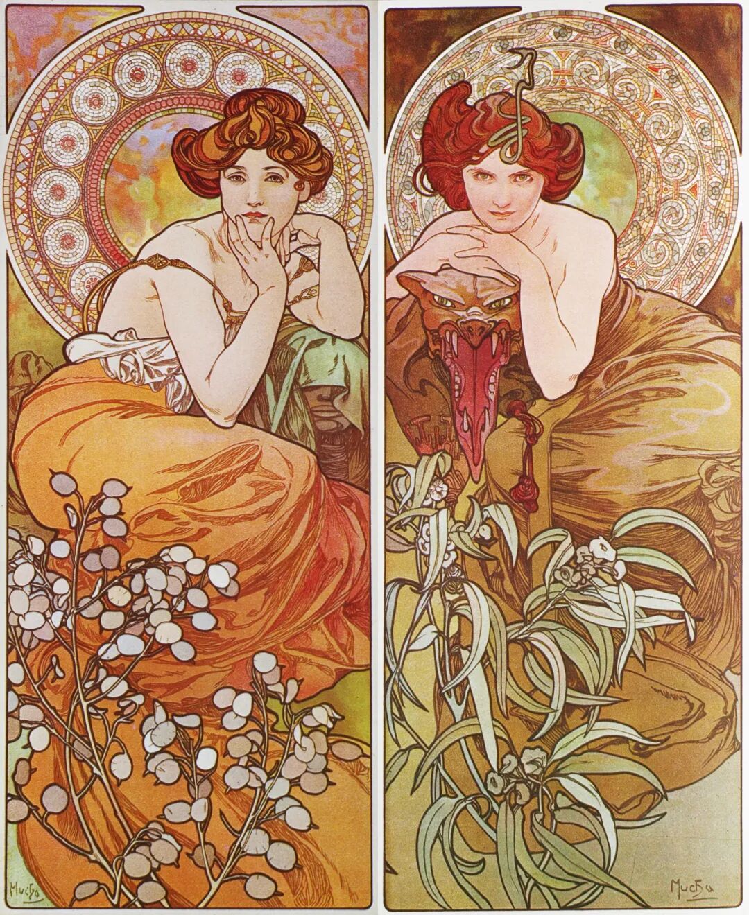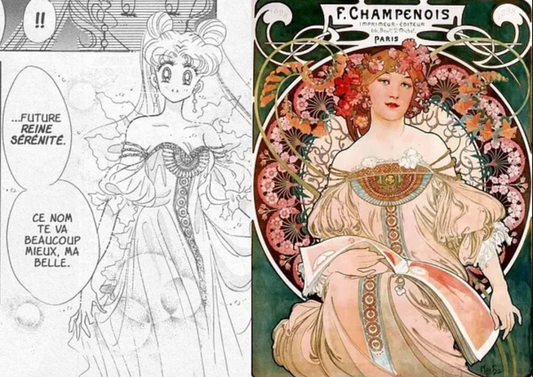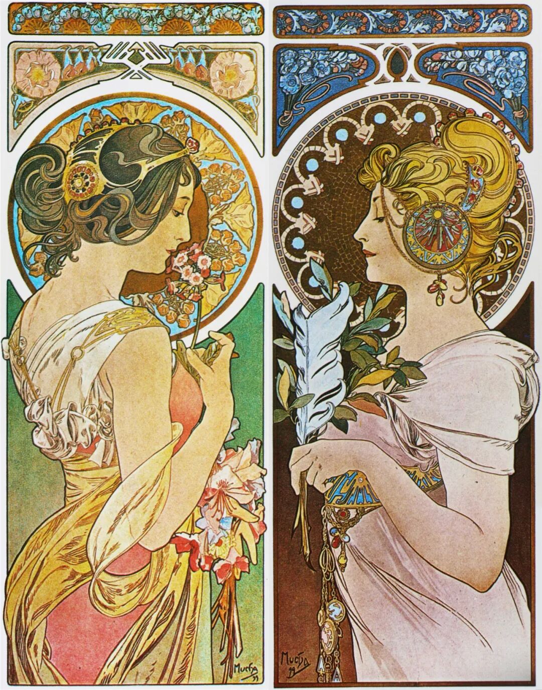 最新文章2024-01-07 纯欲少女,迷倒万千直男!这些极品美人竟出自一位“硬汉”之手! 有这样一位画家 明明是欧洲人,却被誉为“日本动漫鼻祖” 明明绘画出身,却成为珠宝设计界“扛把子” 明明是硬汉,却爱画娇媚迷人少女像 阿尔丰斯·穆夏 一个广为人知却又鲜为人知的艺术家 新艺术运动的捷克创始人、广告插画带头人 随便一个身份都足以令他名声斐然 但在美术史书中却难寻他的身影 如今,随着国内巡回展览的增多 已离世82年的穆夏摇身成为新晋网红 唯美华丽而不失力量的独特画风 吸引观者想要对他了解更多…… 学画之路,道阻且长 有人说与梵高、米勒这些名家相比,穆夏要幸运的多,在困苦时期总能有贵人相助。 但对于这位在时代夹缝下成长起来的“小人物”,象君更愿用“自助者天助”来形容他跌宕起伏的一生。 1860年7月24日穆夏出生了,那时的捷克共和国还未成立,处于民族解放的动荡之中。 因父母是虔诚的宗教徒,穆夏打小就耳濡目染了许多文艺复兴时期的教堂穹顶画,精美绝伦的女神画像让他着迷,埋下一颗学画的种子。 细看其代表作《四季女神》与波提切利(文艺复兴大师)的《春》,无论是细腻流畅的线条,还是柔和清丽的色彩,皆有几分相像。 曼妙的肉体,表达出充满人性的神像。 但因家境贫穷,一直没有机会接受专业训练的小穆夏,只能在唱诗班中自学绘画。 教堂中留存的华贵风巴洛克装饰壁画、雕塑,深深印刻在他的脑海中。 长期在圣洁气氛熏陶下,他之后的画作中不少女性都有一种光辉、温柔的圣母形象。 为了更好地提升画技,成年后他只身去到“艺术之都”维也纳。 白天在剧院打工,晚上在学校接受专业的美术训练,学院派画家汉斯·马卡特的装饰画风对其影响颇深。 边工边学的日子虽清贫,却很充实。 但一场大火烧毁工作剧院,打破了这种平静,他不得不流落各个地方以给人绘肖像、打零工为生。 花若芬芳,蜂蝶自来。 终于,穆夏的满腔才华受到爱德华伯爵的欣赏,出资赞助他前往慕尼黑、巴黎学画。 有人羡慕他运气够好,不用自己卖力赚钱就能享受好生活,冥冥之中失与得总有一个平衡杠杆。 这一时期,他的绘画虽更加成熟却难有新突破。 所描绘的多为甜美婀娜、柔媚动人,与人物周围流畅的植物花纹曲线相辅相成、相得益彰的仙女像。 逆袭为商业插画“鼻祖” 有钱人的任性你不懂,在穆夏过得最安稳之时赞助突然被停掉了。 有人说伯爵是为了督促他更独立发展,有人说是看腻了他的画。 就这样,穆夏又回归到穷困潦倒的生活,甚至连生病看医生的钱都没有。 为了生存下去,他接了大量的书籍、广告插画,边赚钱边提升自己。 此时因正处新艺术运动时期,东西方文化在巴黎相互交融,神秘新颖的东方风格受到热烈追捧。 穆夏对葛饰北斋、喜多川歌麿等大师的版画很是着迷,日本画强调的线条感和平涂用色,以及对世俗生活的表达,融入他的画作之中。 喜多川歌麿《姿见七人化妆 难波屋阿北》《当时三美人》 这种综合性的艺术风格,在代表作《黄道十二宫》中发挥得淋漓尽致。 《黄道十二宫》与日本插画家Takumi创作的宫崎骏动画人物插画 画中女主人公是女祭司形象,金色卷发,侧面示人,头戴拜占庭式的头饰和珠宝,身负黄道十二宫符号,被精致的叶形装饰包围着。 在宗教气息浓厚的氛围中,浮世绘色彩平铺的方式和柔和纯净的色调也得以体现,整体画面不受事物原色限制,一笔一色中表达自己对作品的感受。 当努力积累到一定程度,幸运会不期而遇,穆夏又遇到了人生中第二个贵人。 萨拉·伯恩哈特是当时法国大名鼎鼎的女演员,要演出的戏剧《吉斯蒙达》正赶上圣诞节,知名设计师都放假了没人做海报,在印刷公司万分焦灼之时,穆夏加班救场。 萨拉·伯恩哈特 近两米高的长条形构图,塑造了一个比真人更苗条的形象。 海报中的人物不仅身着华丽长衫,神采奕奕,还装饰上了宗教圣像画中常见的圆环装饰结构,让人瞬间变得崇高和神圣起来,整体上彰显个性和美丽。 作品一经面世便引起轰动,大家纷纷称赞太美,女明星开心的和穆夏签订六年海报合约。 一炮而红后,大量的广告宣传订单找上穆夏,从香烟、食品再到自行车,几乎都有涉猎。 Lefévre-Utile品牌饼干 就连演员佩戴的珠宝设计,都被他一一承包。 珠宝设计手稿与成品 更牛的是就连老上海月份牌中,皮肤白皙、身材丰腴的女性,都与他笔下女性有几分神似。 这种将广告、绘画、装饰、设计融合在一起的艺术风格,成为新艺术运动重要表现方式。 后来的日本漫画,深受其影响,生动诠释了民族的才是世界的。 穆夏同款美少女纱裙 快节奏的赶工、商业性质浓郁的创作,在让穆夏名利双收的同时,也陷入一种迷茫。 艺术为谁创作? “我的画,装饰着上流社会的沙龙,衬托上流社会的人。与此同时我的同胞为了解渴,却只能喝阴沟里水。我发誓,我将把我所有的创作献给同胞,直到生命最后一刻。” ——穆夏 在巴黎过着优渥生活的穆夏,想到处于战争中的同胞还在水深火热中,久久不能平息。 强烈的民族意识促使他放弃一切,离开巴黎回到故乡。 商业绘画对他已无多大意义,创作一个更宏大主题:“南斯拉夫史诗”,反应整个斯拉夫民族从史前到十九世纪民族苦难与光荣的历史。 为了全身心创作,穆夏独自搬到郊外创作,大大的草稿就画了几百张,工作量大到家人见他都