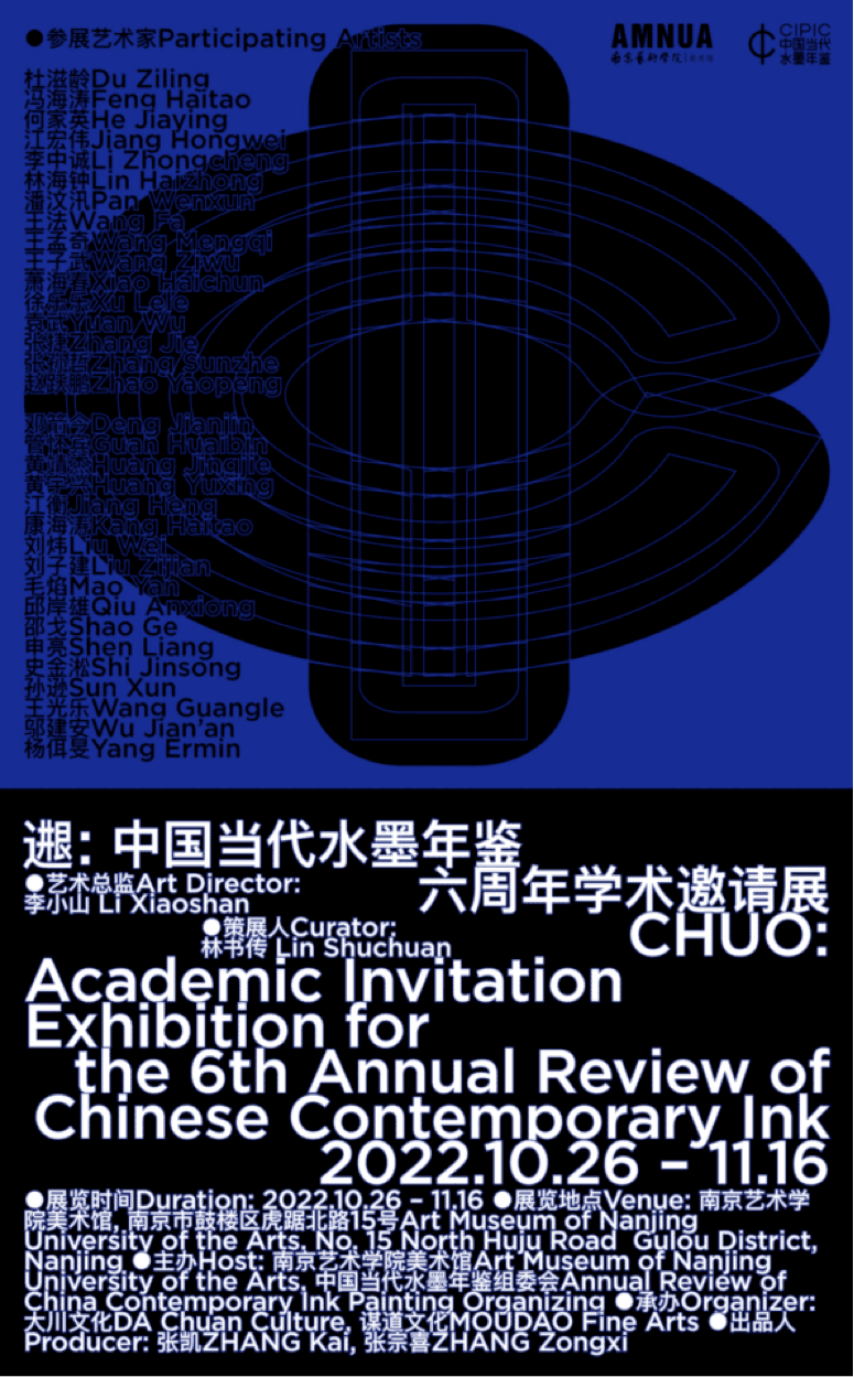 2022年,同样的地方,依旧在南京艺术学院美术馆,面对“闭环”之后的命题,我们以“Chuo(进退)”为命题,提供一种两级的状态,我们搭“擂台”,却不提供对抗的规则。进与退在“擂台”中仅仅是两个常规的的动作。本次展览邀请了33位艺术家,分为两组,以截然不同的作品面貌来进行回答。第一组艺术家邀请了水墨(中国画)领域的16位艺术家,通过更加靠近传统语言的作品来进行参与,同样另一组17位艺术家则邀请了在当代艺术领域通过水墨(中国画)材料来进行更偏向于当下表达的创作。这是一次去除中间段的展览尝试,同样也是面对“闭环”和解答“闭环”的一种新的角度。