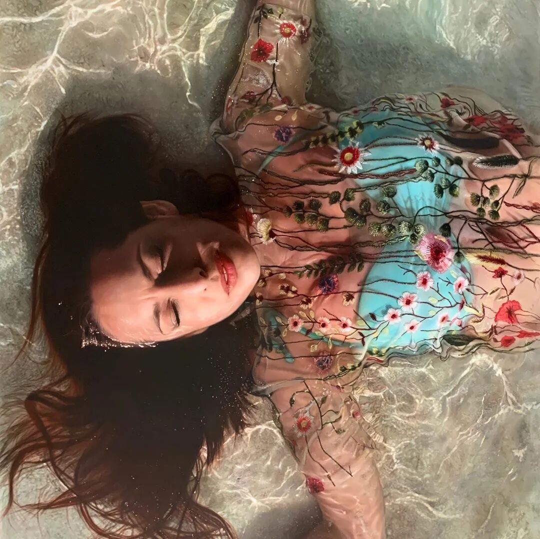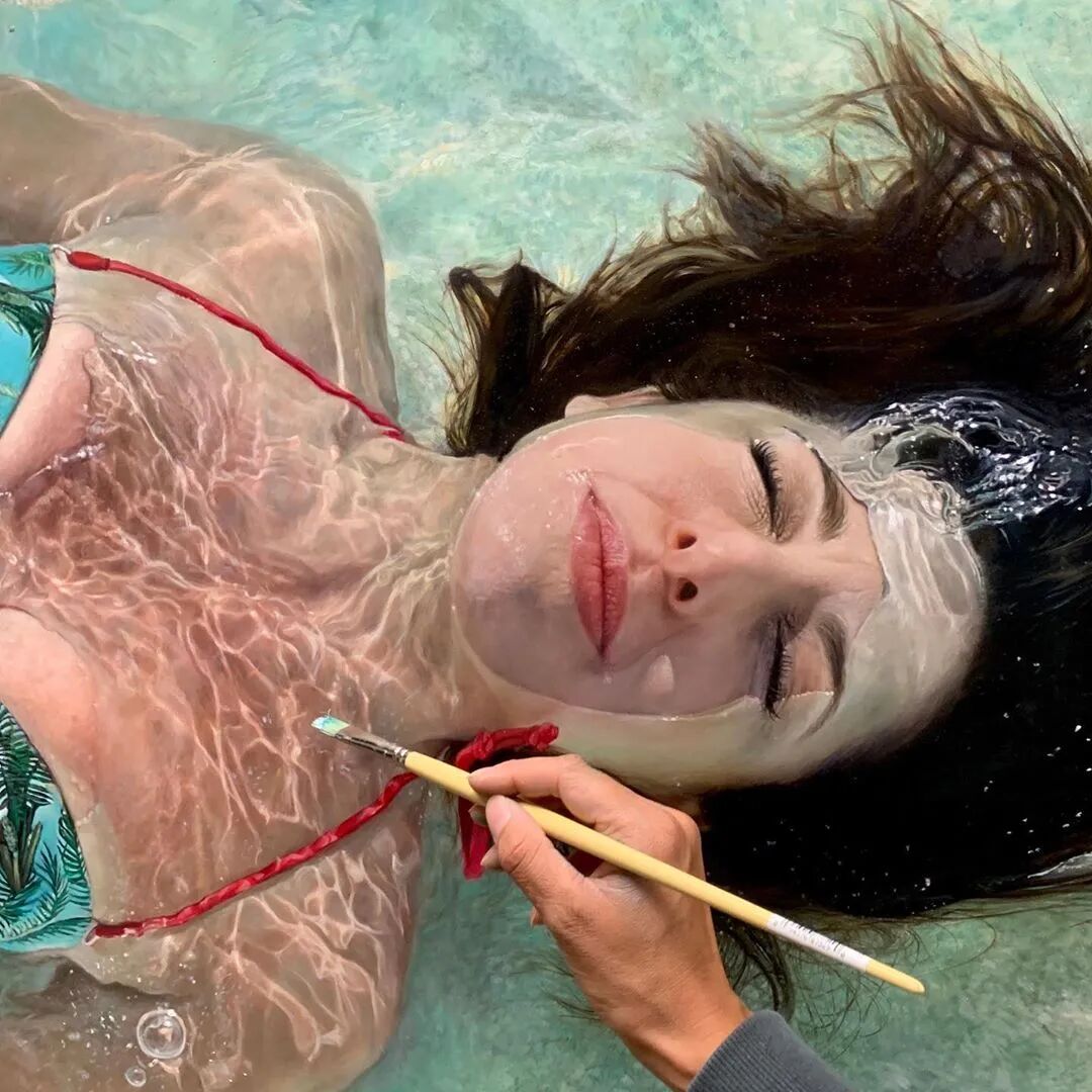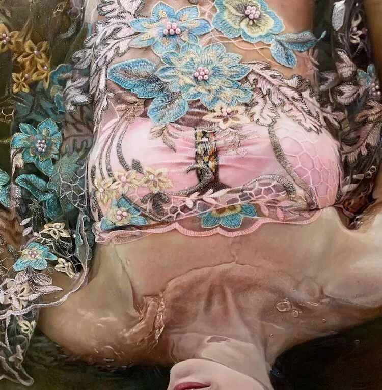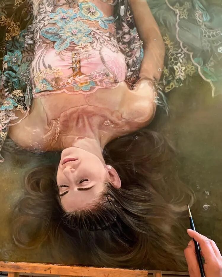 荷兰艺术家Marissa Oosterlee以逼真的绘画技巧而闻名,她能够用画笔完美绘制高精度的人物。她绘画对象大多选择置于棘手的环境中(如闪闪发光的水)来展示自己的能力。在她的系列《洗去我的悲伤》中,她将具象的绘画与对海洋的热爱相结合,描绘了半淹没在清澈水池中的女性。