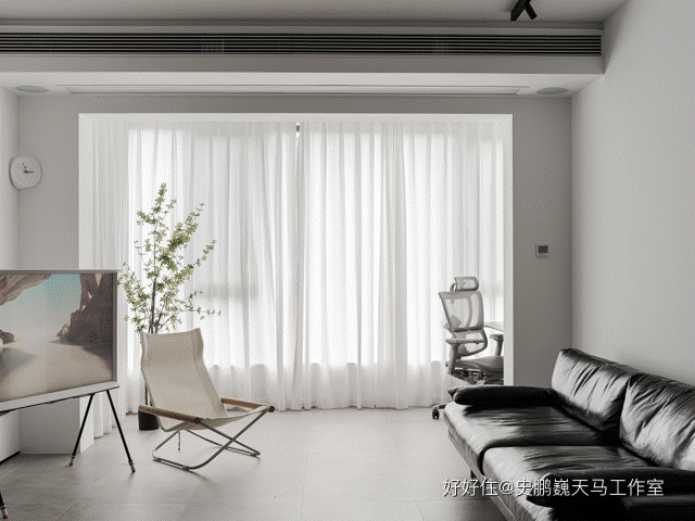 史鹏巍天马工作室:客厅的后面是次卧,用到顶的移门隔开,目前是作为留白空间。或许父母会来短住,或许某天会多个可爱的宝宝,到时候再灵活配置即可。