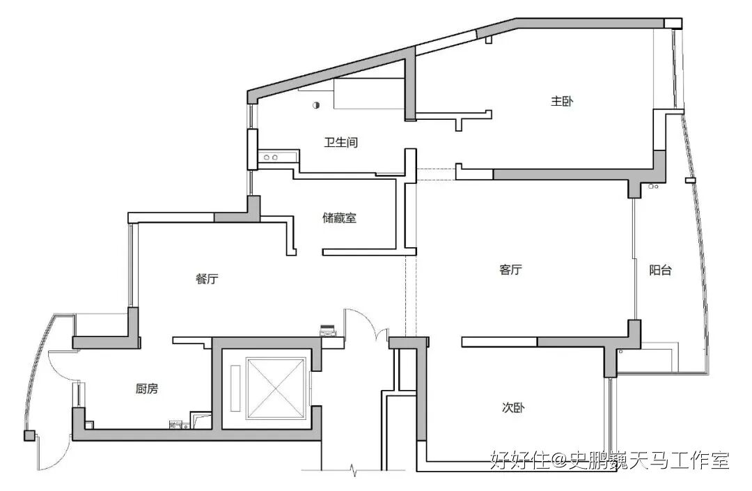 史鹏巍天马工作室:房子位于上海古北中心地带,建面132m²,使用面积101m²,原始户型是两房两厅两卫一厨的格局,前任业主为了解决储物,将其中一个卫生间改造成了储物间。 优点: