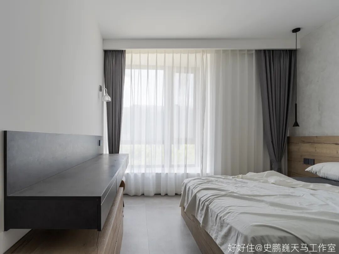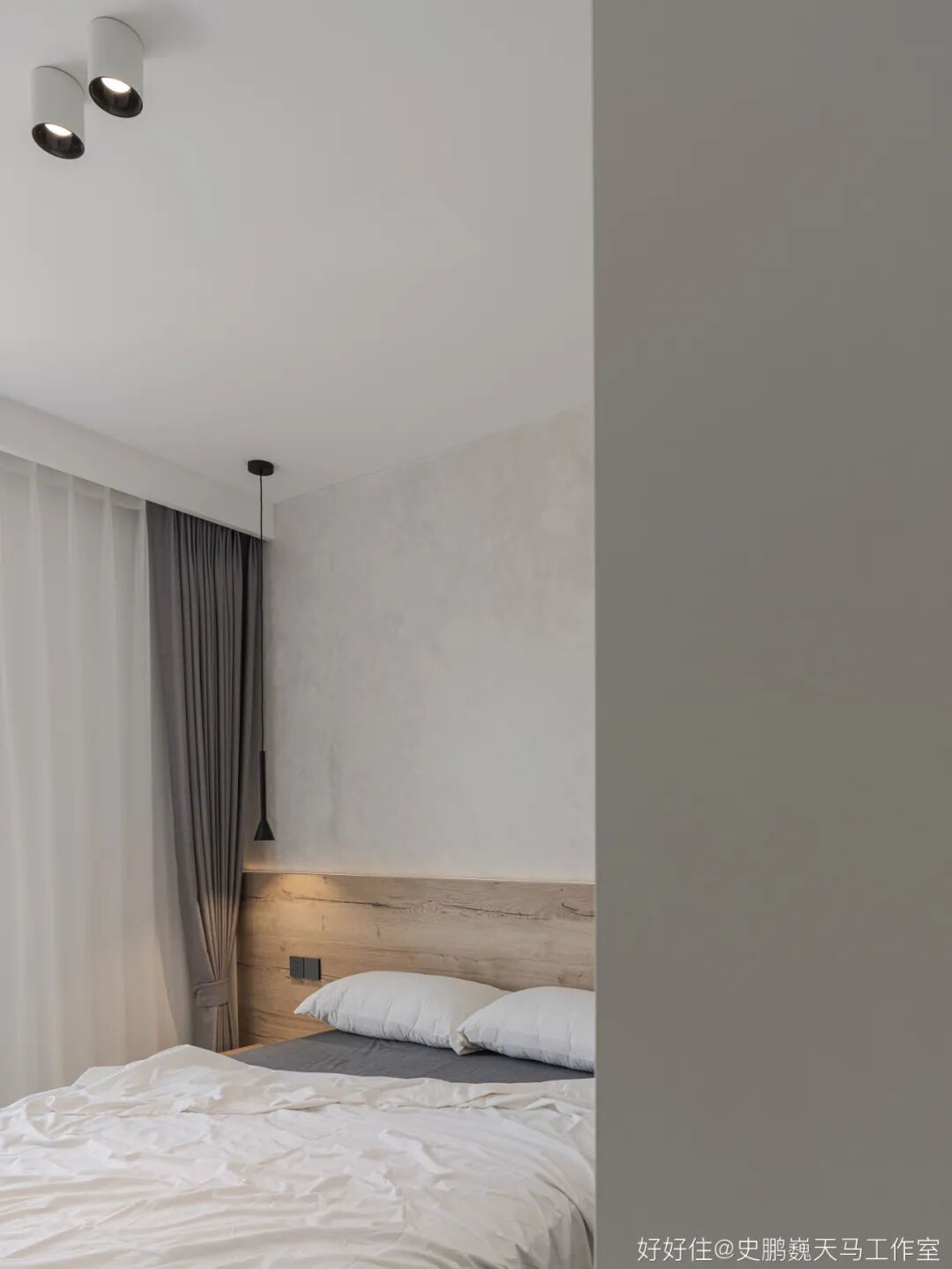 史鹏巍天马工作室:之前的卧室有一道斜墙,空间很难利用,且床背景不是很完整,推门便可以看到床,缺乏仪式感和私密性,由于公区空间退后,整体让出了一条过道。于是我们重塑了主卧的入口。我们将床的位置反了个向,重新设计了动线,在动线的两侧布置了衣柜,并且将床一侧的衣柜做了悬浮设计,增加了通透性,使空间增加包裹性的同时,不至于压抑。