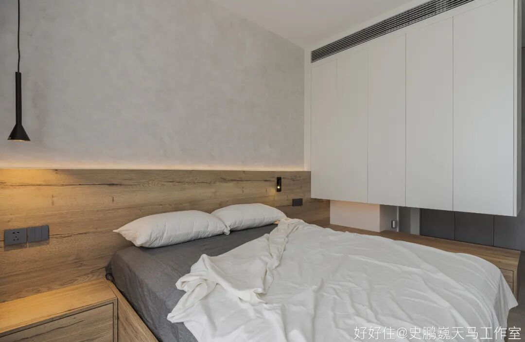 史鹏巍天马工作室:悬浮柜顶上,还有玄机。在前期设计时计算好了空调的定位排管,很巧妙地将内机放置在了悬浮衣柜的上部,和柜体融为一体。主卧整体采用的是白色,木色和灰色的组合,地面铺贴了地砖,而不是大部分人家的地板,这也是充分尊重了业主多年国外居住的生活习惯。