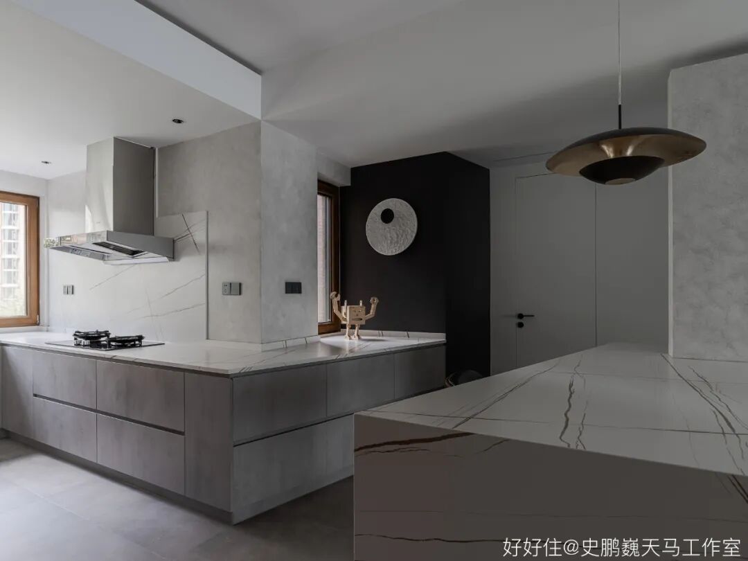 史鹏巍天马工作室:厨房背景,也没有满铺瓷砖,而是用岩板加艺术涂料。