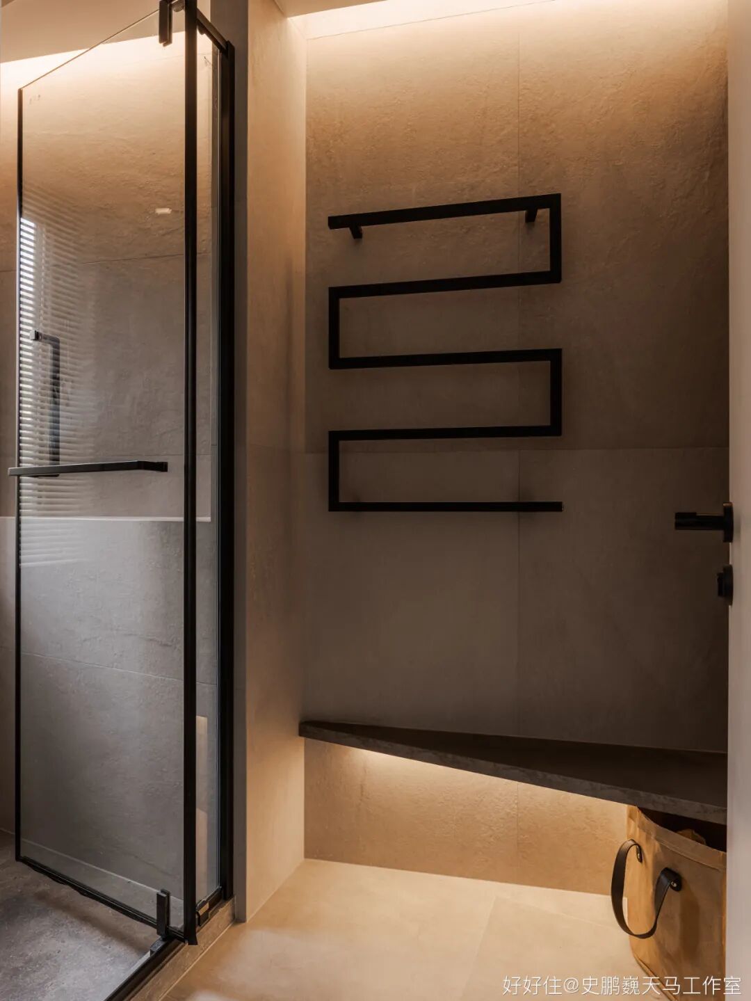 史鹏巍天马工作室:对于卫生间,业主有个核心诉求,是需要解决两个人需要同时使用卫生间的问题,特别是赶时间的时候。常规的做法,肯定是放两个卫生间嘛。但我们仔细分析了业主生活习惯的卫生间使用场景,发现对洗漱、如厕、洗浴做三个独立的空间即可解决他们的需求。所以我们拿这套方案说服了业主,与其用两个小卫生间,不如用一个更大的解决。使用体验和效果都更好,空间利用率也更高。
