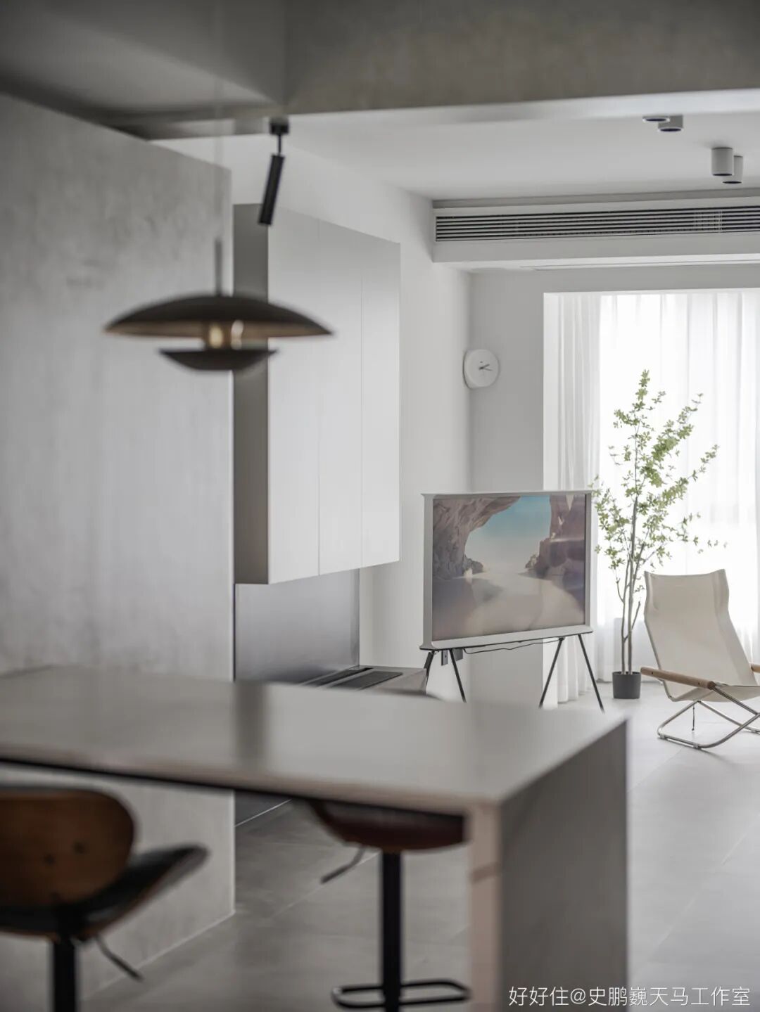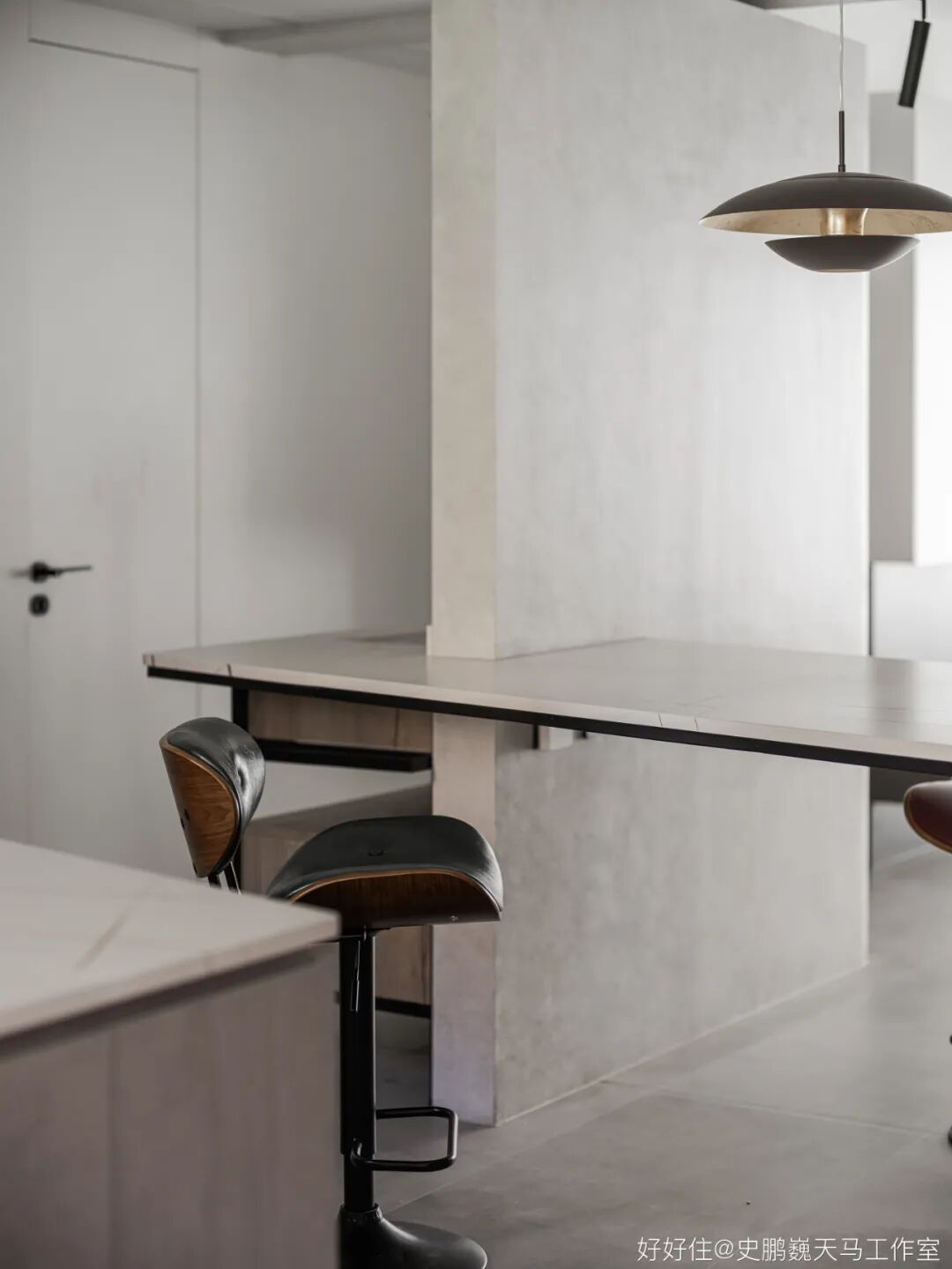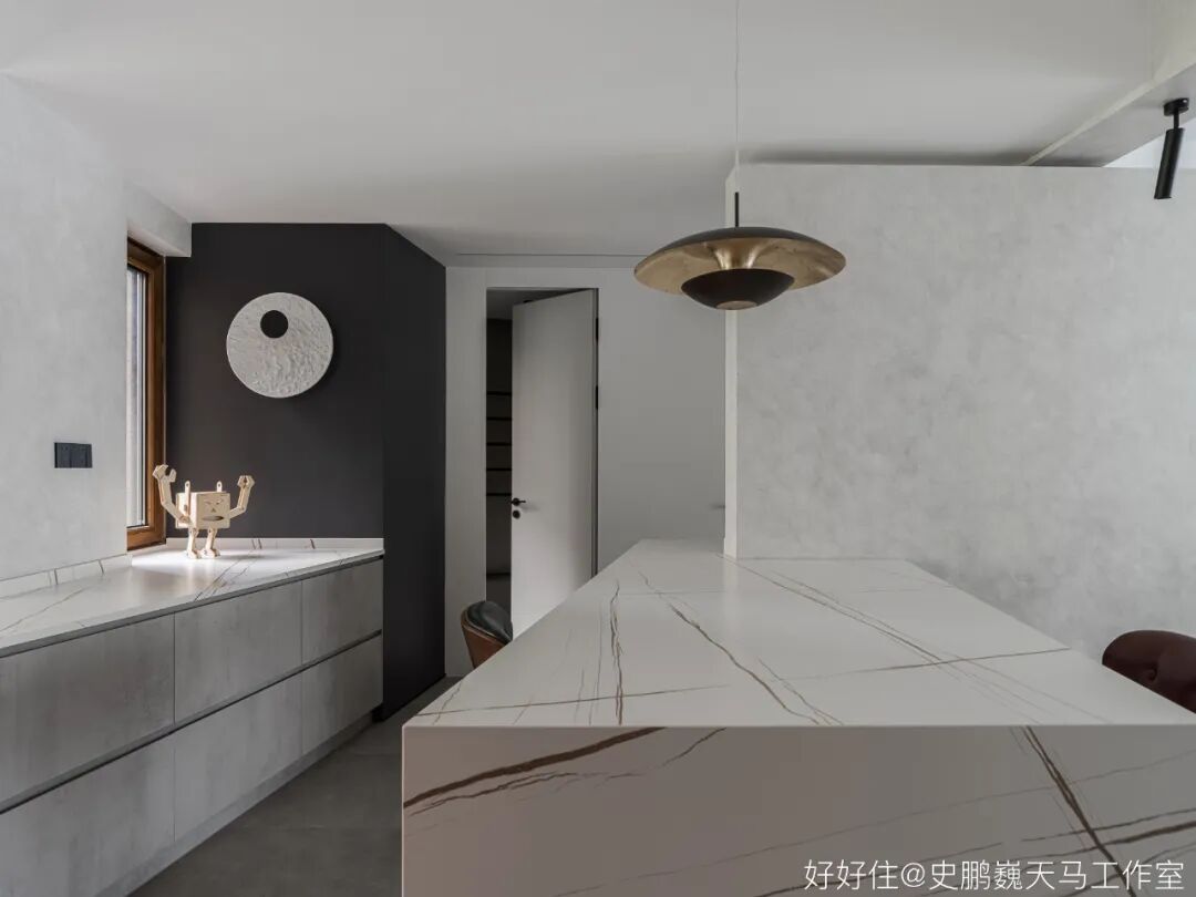 史鹏巍天马工作室:完成效果。原本鸡肋的储物间,变成了开放的中岛区域,与厨房、客厅、甚至洗漱区都联通。