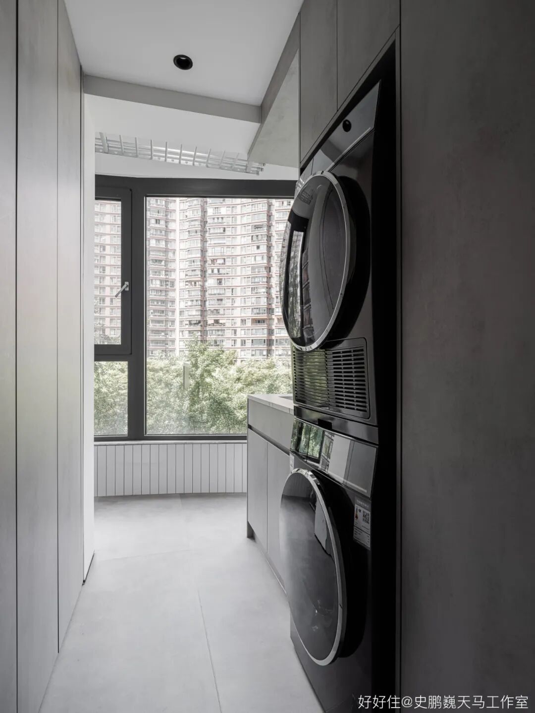 史鹏巍天马工作室:厨房外移后,我们利用原有厨房空间,做了个功能齐全的家务间。从外往里,依次是工具收纳柜、差旅箱包柜、长期收纳柜、换洗收纳柜、洗衣区、晾晒区,按照明确的操作动线来规划的空间。