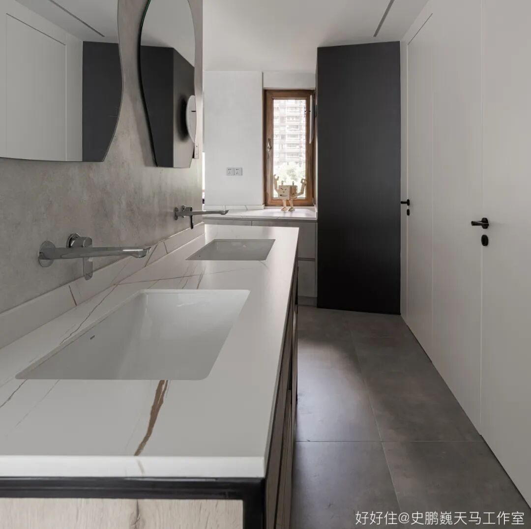 史鹏巍天马工作室:尽管只有两人住,我们也设计了双台盆,至于为什么,后面我们在介绍卫生间的时候再讲。由于有双台盆的需求,我们只得将台盆区域外移,顺势就与中岛连接到了一起,从而形成一个有趣的整体: