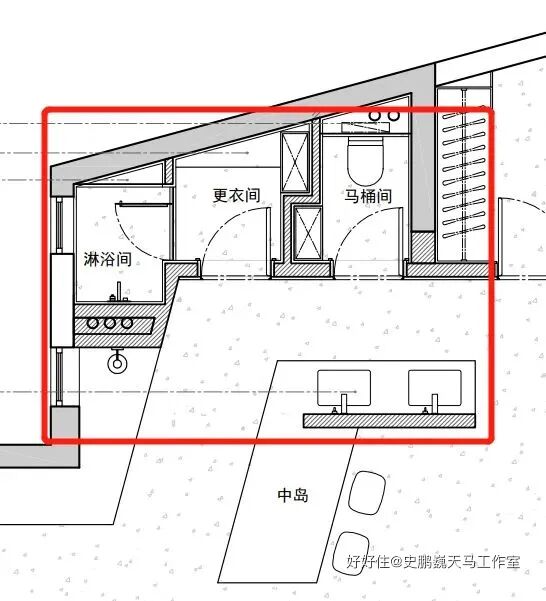 史鹏巍天马工作室:从图面上能看出,原建筑在卫生间这里是有一道斜墙的,上任业主的解决方案是把墙拉直,浪费了一平米多的空间,而我们采用因地制宜的方案,利用斜角做了壁龛、换衣凳、收纳柜、隐藏式水箱等等。在规划淋浴区的时候,往往会遗漏掉很重要的一环,就是毛巾衣服等,放在哪里。虽是小问题,但很影响使用体验。我们更倾向于,在有条件的情况下,尽量设置换衣区或更衣间。