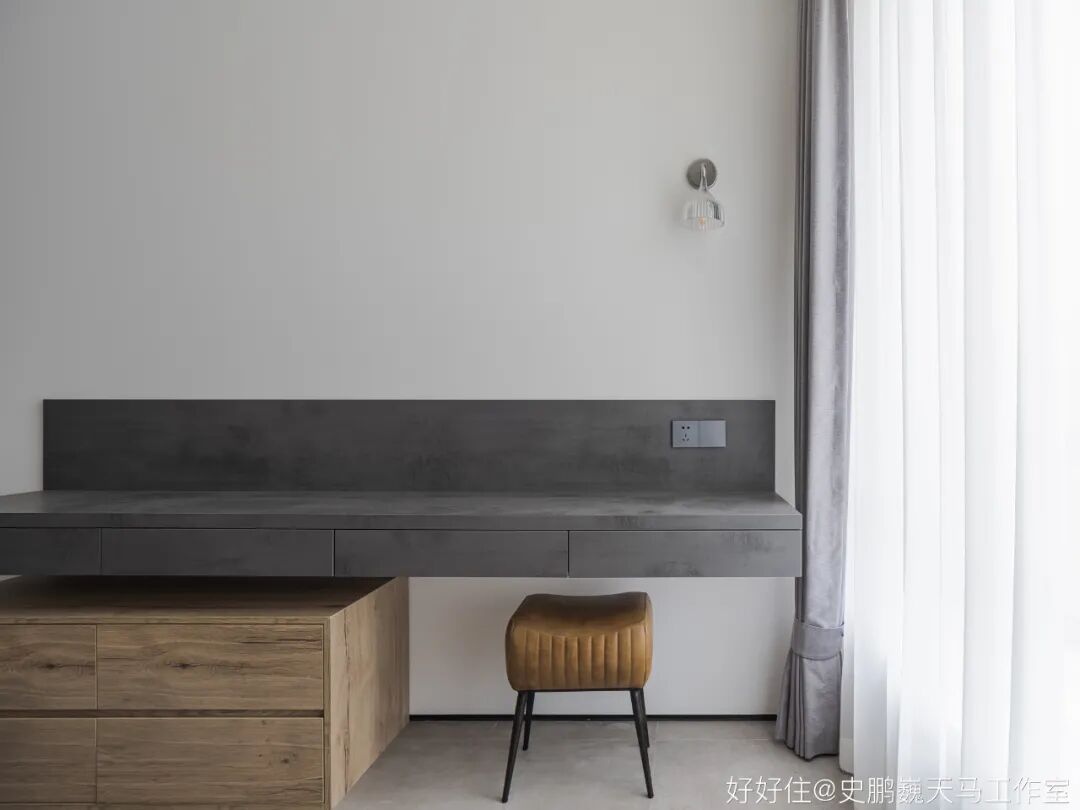 史鹏巍天马工作室:比如利用阳台转角,给男主创作了一个安静的办公位,放进了他的升降办公桌。这里其实是景观位,窗外是楼下邻居的空中大露台,我还跟业主开玩笑说,既能享受花园美景,还不用自己打理,邻里关系维护好一点,想看什么花,想看什么树,还能让邻居帮忙种上。