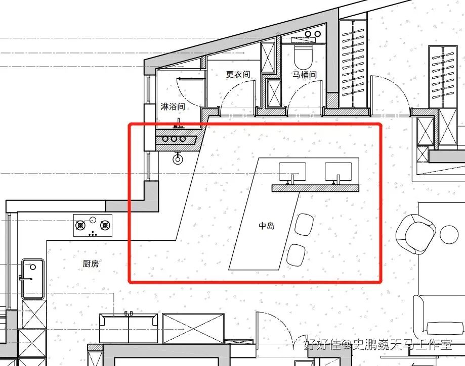 史鹏巍天马工作室:打开后将功能区域和动线进行了重新规划。特别需要说明的是,注意图中中岛及边上的橱柜台面,都做了倾斜处理,是为了避免进门正对直角冲撞,也让淋浴间后面压缩不掉的管道井,在视觉上被弱化。