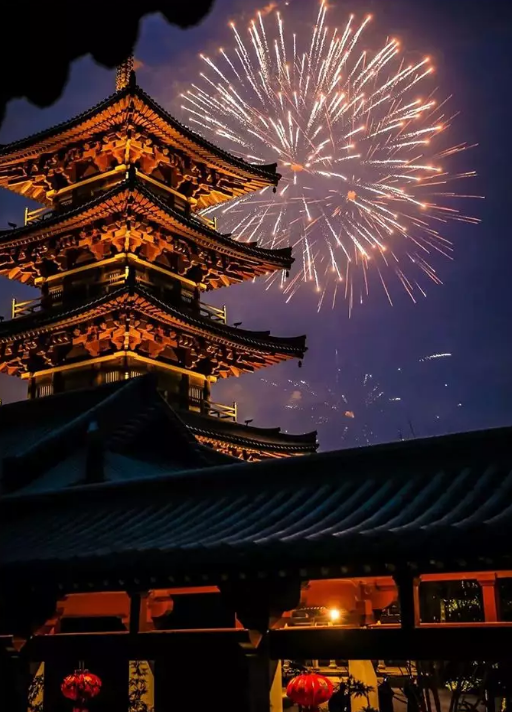 这时,屋内是通明的灯火,屋外是震天的响声。迎神的鞭炮和烟花,把除夕的热闹氛围推向了最高潮。过去的文人墨客,总以最美好的诗句赞颂新年的来临。王安石的《元日诗》:爆竹声中一岁除,春风送暖入屠苏。千门万户曈曈日,总把新桃换旧符。