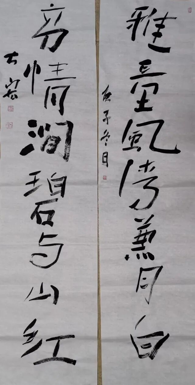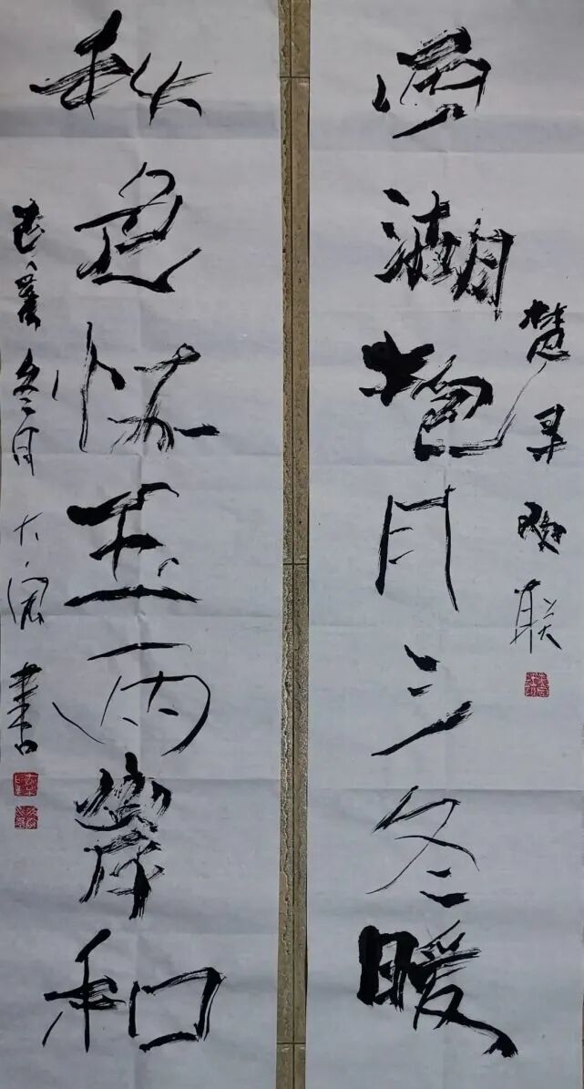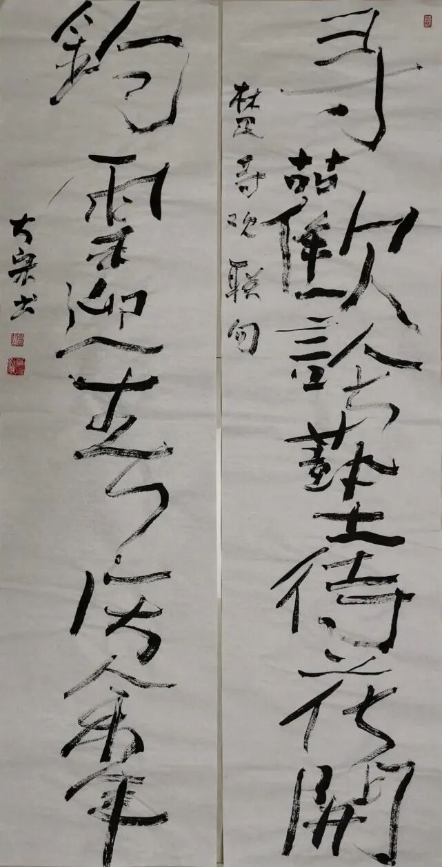 人怕鼓励,一鼓励就要飞,就要泉水叮咚。想一想,既然联都出了,那就硬着头皮写吧!写不好也是自己兄弟,大不了撕了。哥俩来到画室,铺开纸张立刻开写,不自信地写完后,我认为没有写好,楚弟说写的很好。平生写的第一幅对联就是在楚弟的逼迫和鼓励下完成的,老弟说他要送给杭州君悦酒店的林大姐,那时我还不认识林姐,心想第一次书写就可以出柜?这成吗?反正也算是一种鼓励,心里还是有点打鼓,写都写了,那就自信一点,结果兄弟发在朋友圈有不少专家还说好,我有点懵了,其实好与坏我不在乎,在乎的是兄弟情。