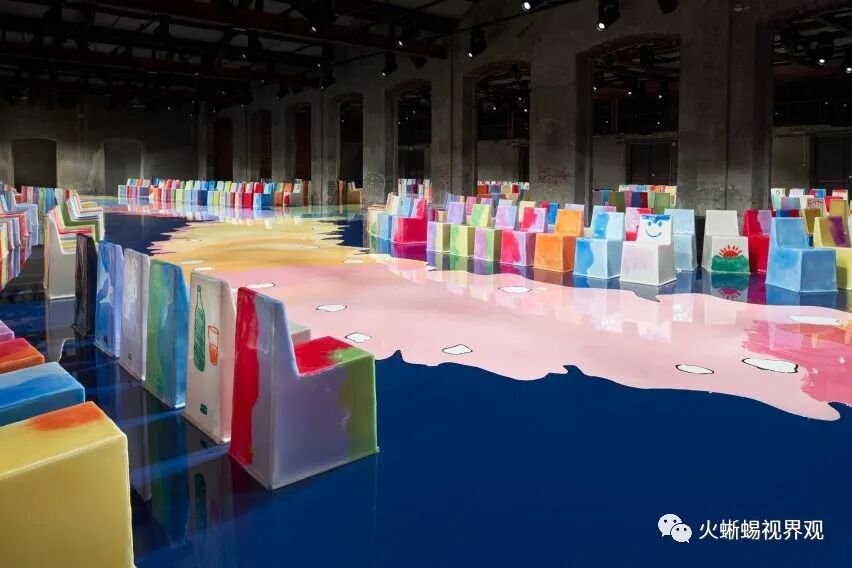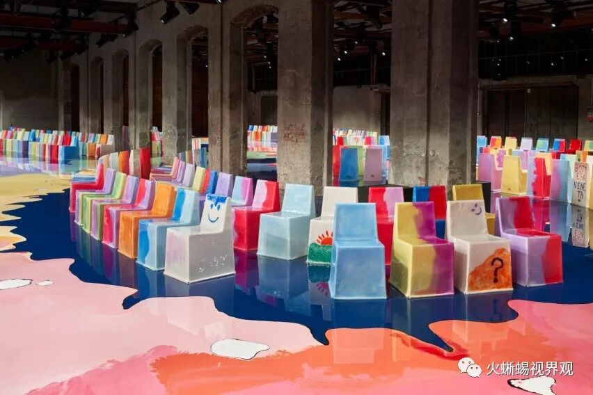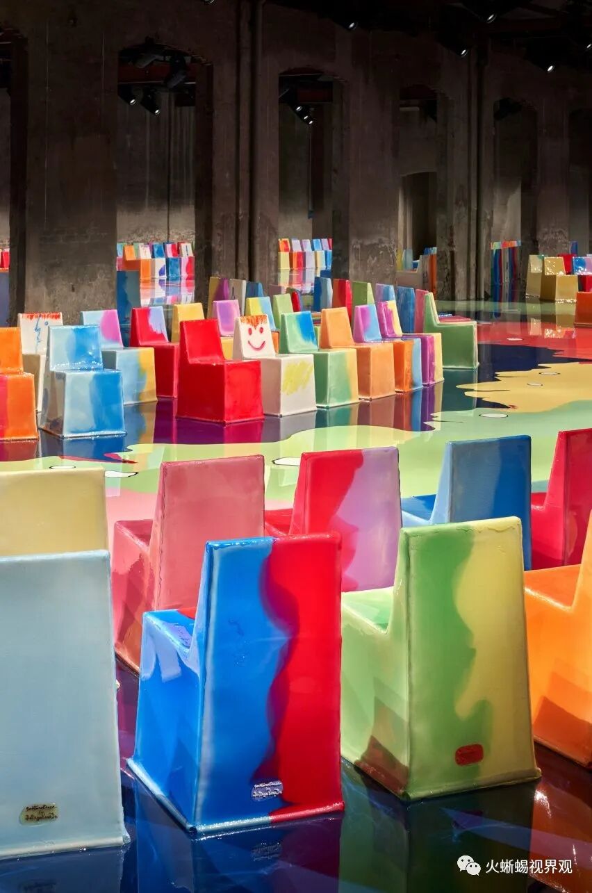粉色、蓝色、橙色和紫丁香色调的椅子充满了这座混凝土仓库,这些椅子的形状比盖塔诺·佩西(Gaetano Pesce通常所熟知的椅子更简单、更拘束,其特点是简单的方形底座和锥形靠背。每把椅子都是用棉帆布制成的,然后将其浸在彩色树脂中,有的还用手绘和文字进行定制。这些椅子的饰面和颜色都很独特,有融入盖塔诺·佩西(Gaetano Pesce手绘的画以他标志性的笑脸为特色,而其他画的背面则标有Bottega Veneta”的品牌logo。