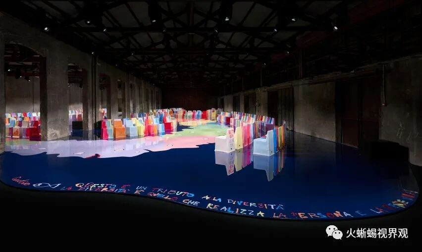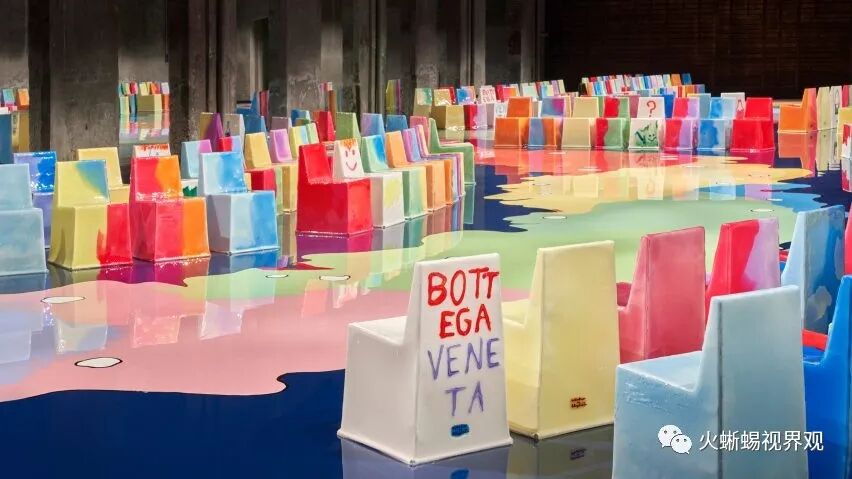 这是Bottega Veneta品牌刚刚上任不久的年轻的创意总监Matthieu Blazy委托盖塔诺·佩西(Gaetano Pesce)设计制作的。这个临时展览空间的特色是定制树脂浇注的地板和400把椅子,这不仅是盖塔诺·佩西(Gaetano Pesce的新设计,这位建筑设计师以其色彩丰富、触觉灵敏的树脂作品而闻名,也是多年来原创椅子中又一次设计椅子。
