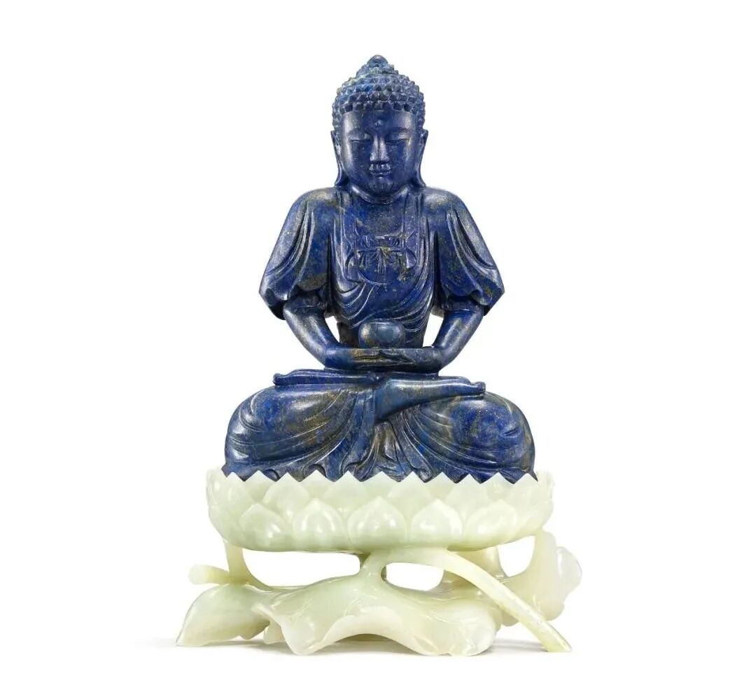 清乾隆 青金石阿弥陀佛坐像连白玉莲座 20.8 cm