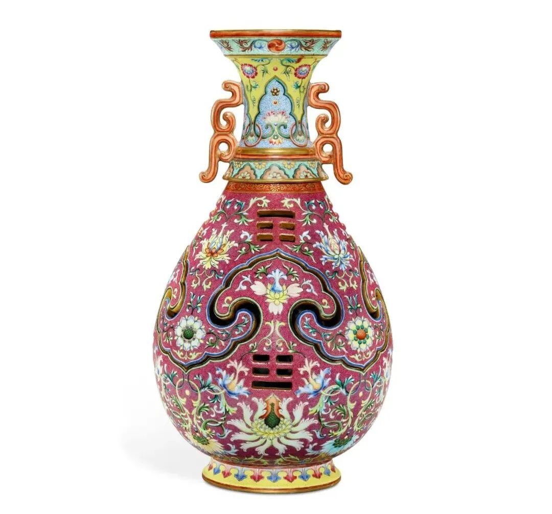 清乾隆 御制洋彩紫红锦地乾坤交泰转旋瓶 高31cm